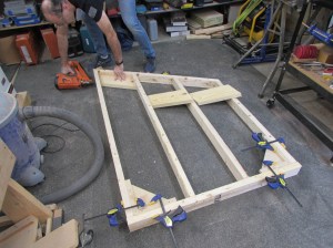 After the main base is assembled, I can verify dimensions and cut the joists. These are attached with screws form the outside, also for disassembly later.