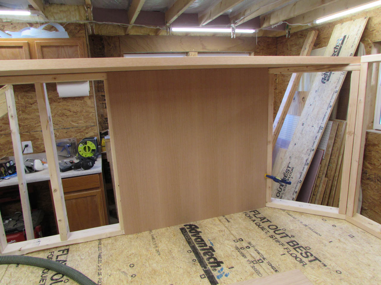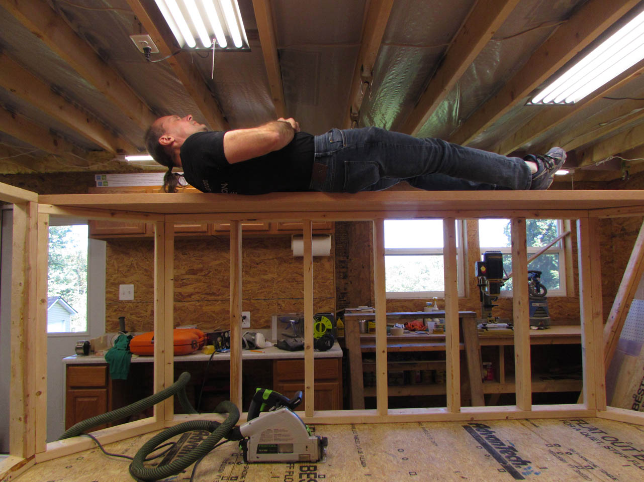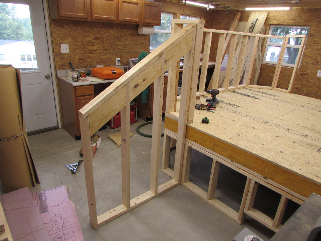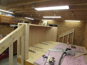 The first step for me was to clean out an area large enough to build the platform. The main platform is roughly 10′ wide and 8′ deep, along with two sets of stairs that add an additional 42″ to the width on each side. I took down my spray booth and cleared the entire back end of my shop to get just enough room.
