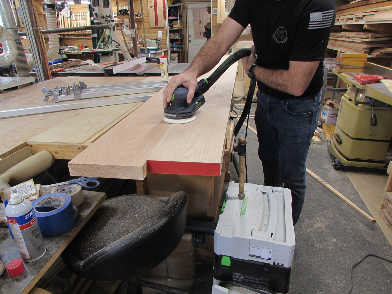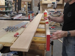 There will be a thick oak shelf along the back for seven large brass\oil-filled candles to sit on. I am gluing together two pieces of 1-1/2″ thick red oak to create a 16″ deep, 10′ long shelf.