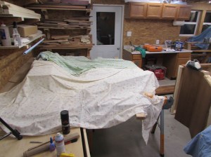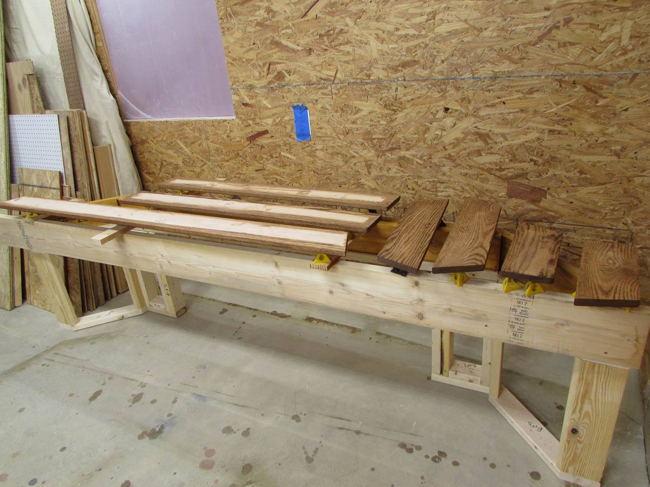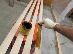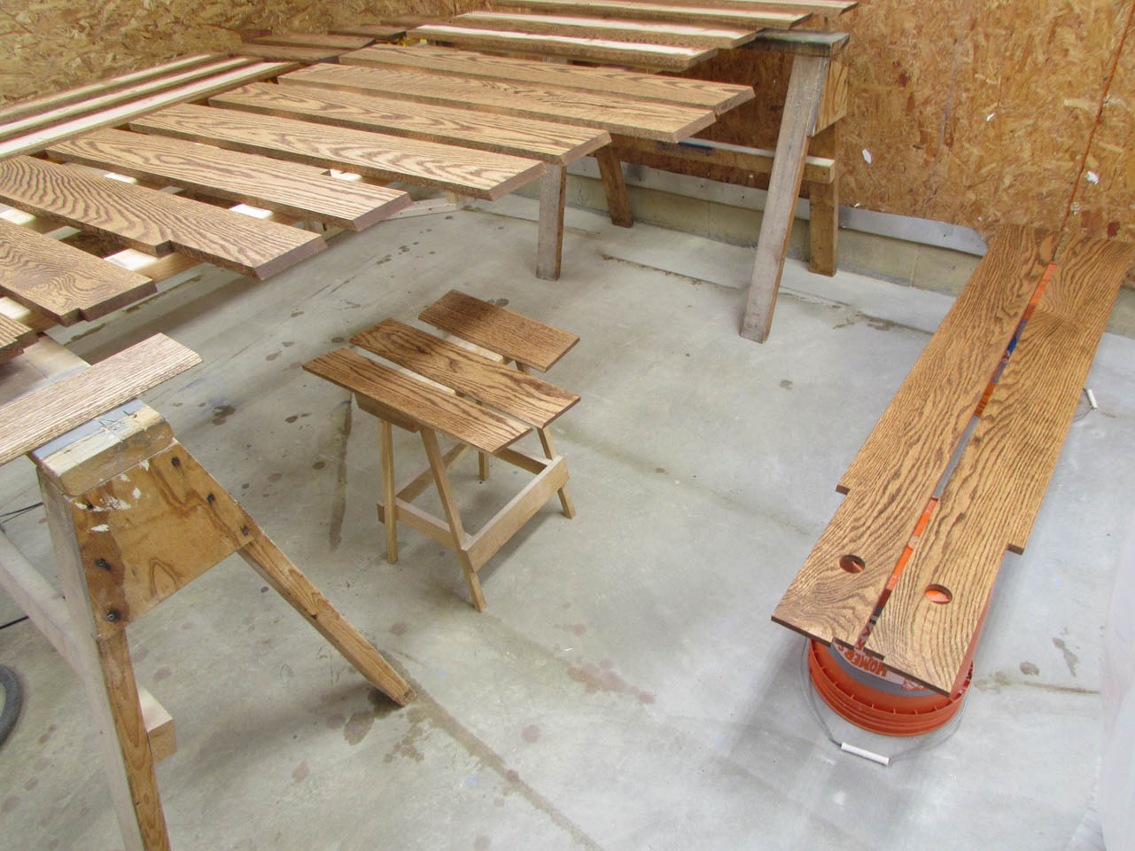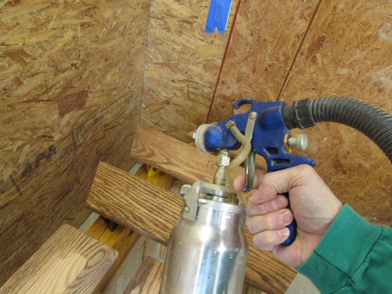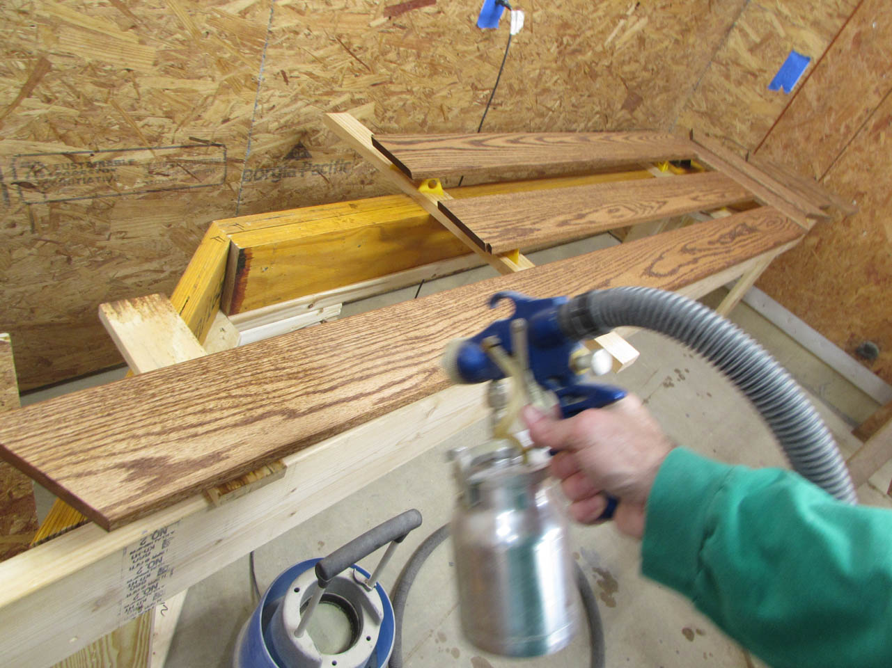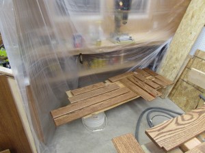 I moved the majority of the structure out of the back of my shop before staining but I still don’t have enough room to set up a spray booth. I grabbed a couple of old bed sheets and draped them over the trim and treads as well as some of my tools in the vicinity. This will protect them from over-spray.