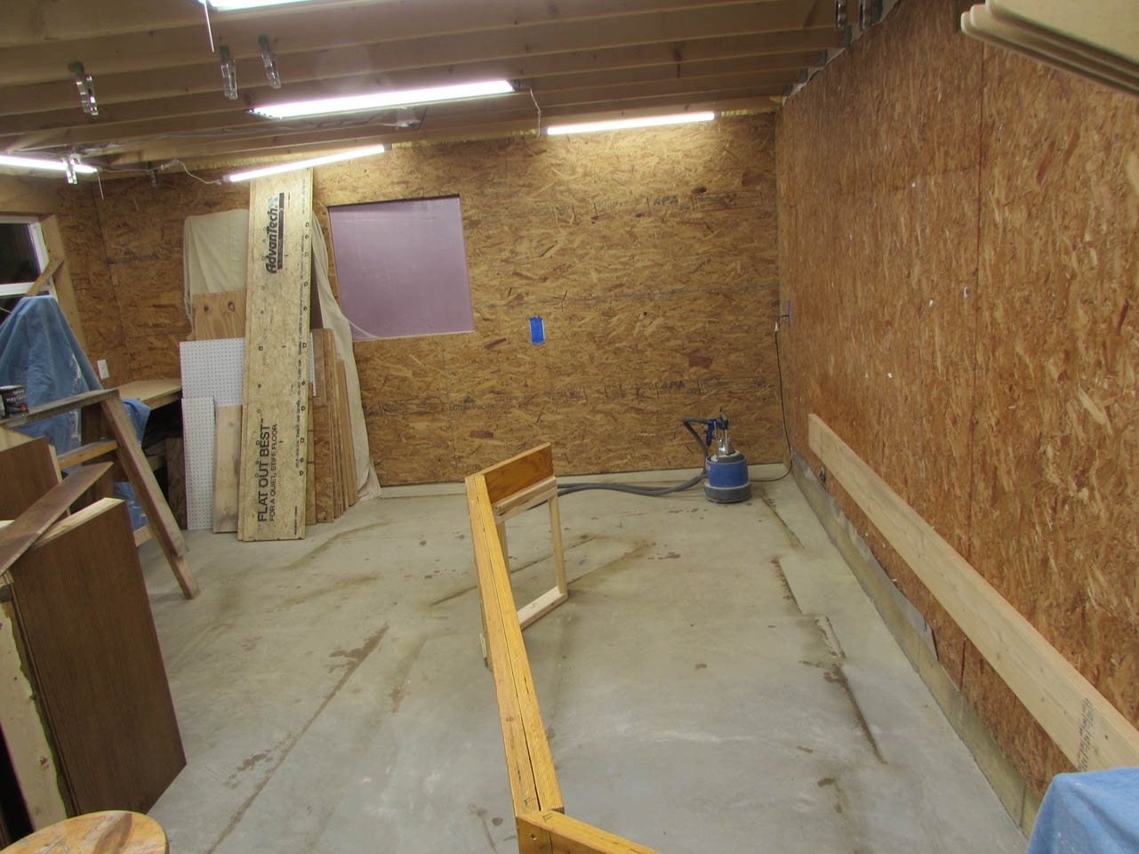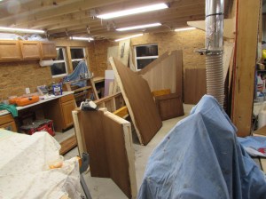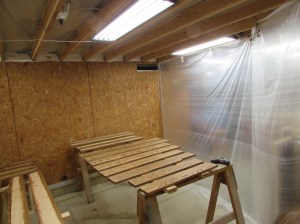I arranged the plywood panels around the room, along the walls, and up against the back wall of the support structure. It won’t fit anywhere else at the moment and over-spray won’t hurt it.