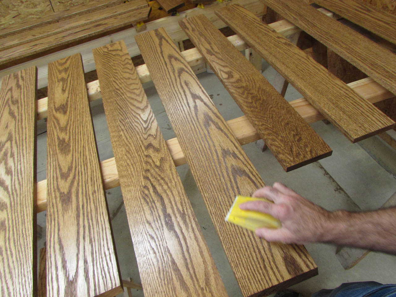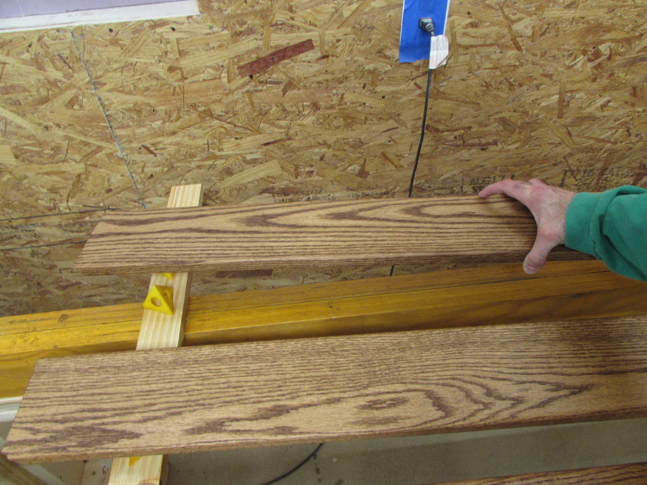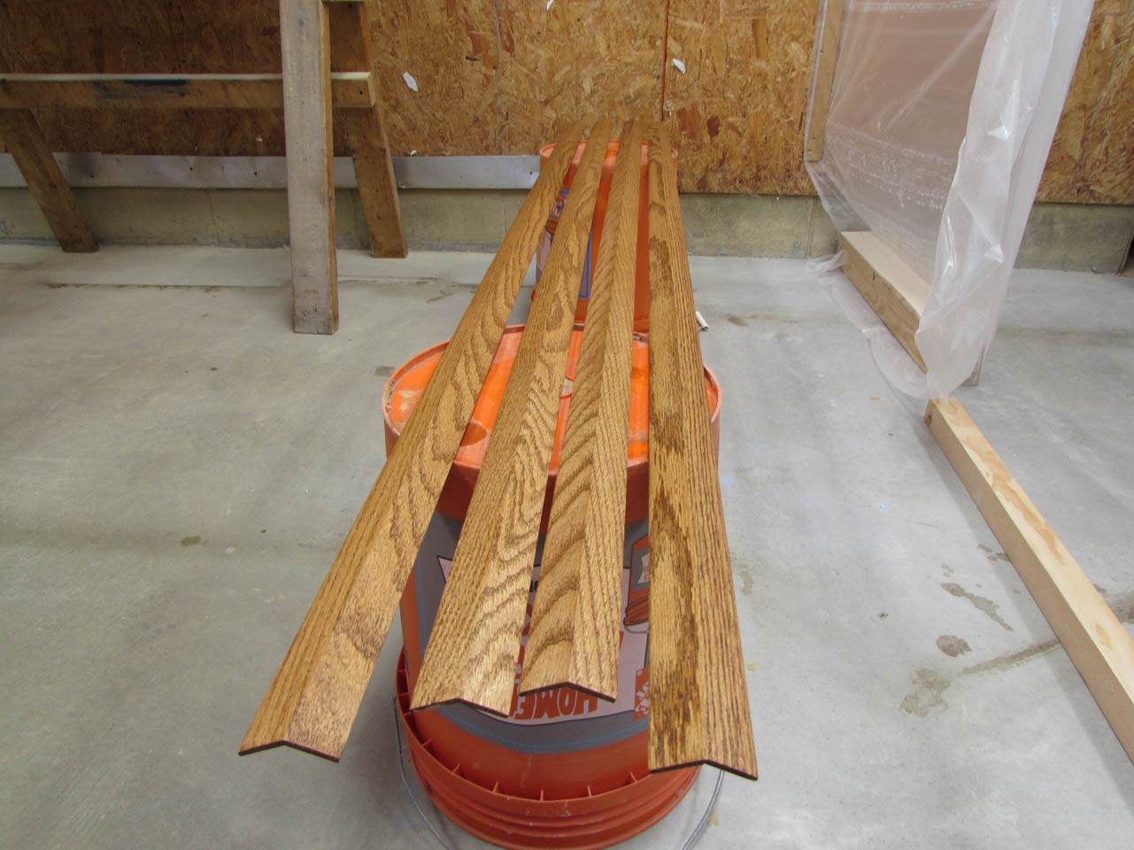 I used the last few dregs of stain that I had to stain the outer sides of the angled trim. Then I repeated the spray-sand-spray process on these as well.