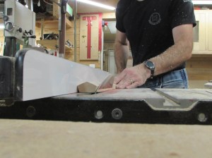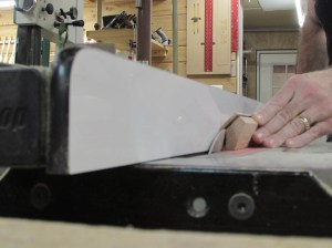 To create the 1/8″ thick trim, I move the fence 1/8″ from the blade and lower the blade to 7/8″ tall and make two cuts with the sanded face held tight to the fence.
