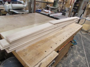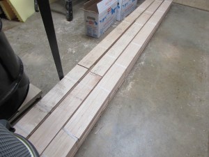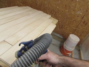 I want the maple to stay as creamy white as possible to blend in with the marble at the altar. To achieve this, I have to stay with a water-based floor poly. I discovered that the water-based is thin enough that I can spray it so I laid out an entire bundle on plywood and sprayed each bundle together.