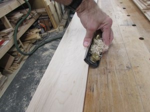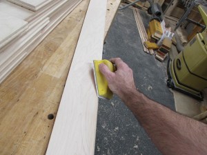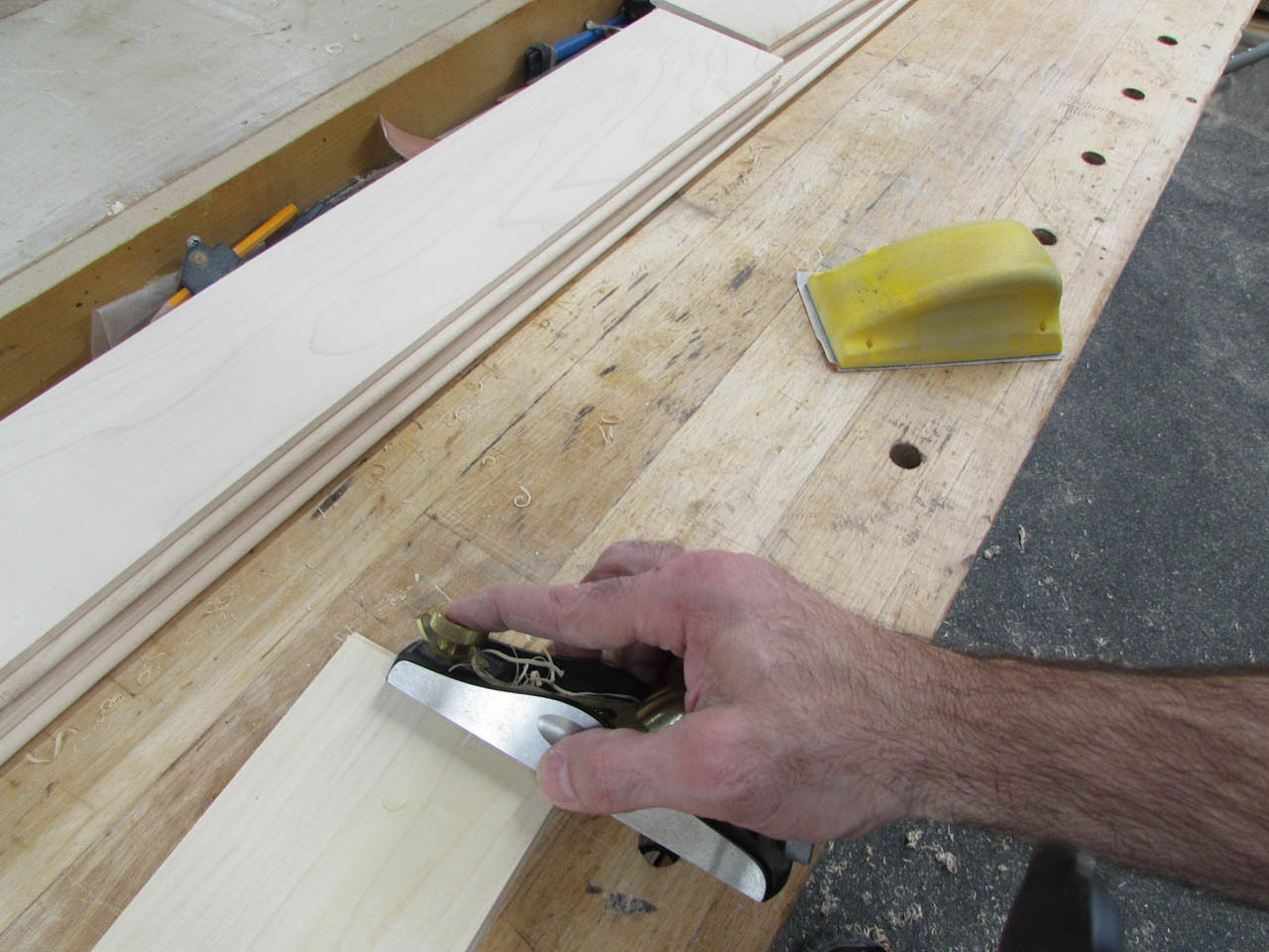 After each piece gets about four swipes with the block plane, I hand sand each bevel.