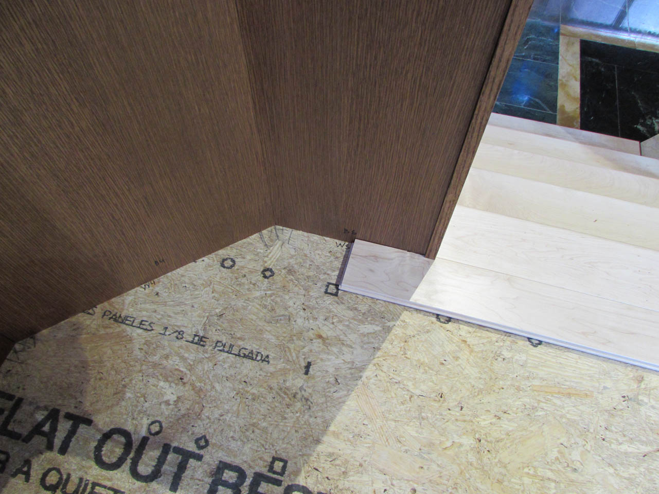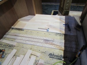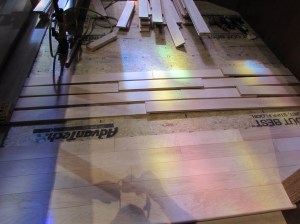 As I lay the flooring, I am using random length material so I have to be careful to have any seams at least 6″ away from any other seams.