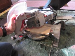 I brought my portable chop saw for the angled cuts. I cut the piece allowing up to 1/4″ of gap that will be covered by trim after the floor is down.