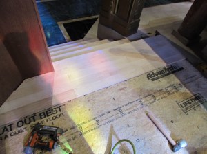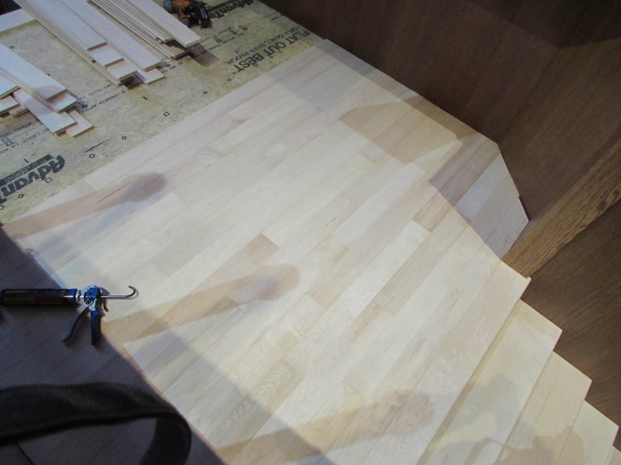 My calculations show that I will wind up with a roughly 4-1/4″ gap after installing all but the last row of flooring. Since I already have the bullnose at the top of the steps installed, the last piece will need to be custom cut to fit. I have 4″ flooring so to avoid having a 1/4″ wide strip at the end, right at the top of the steps. I am making a custom piece that is a little wider.