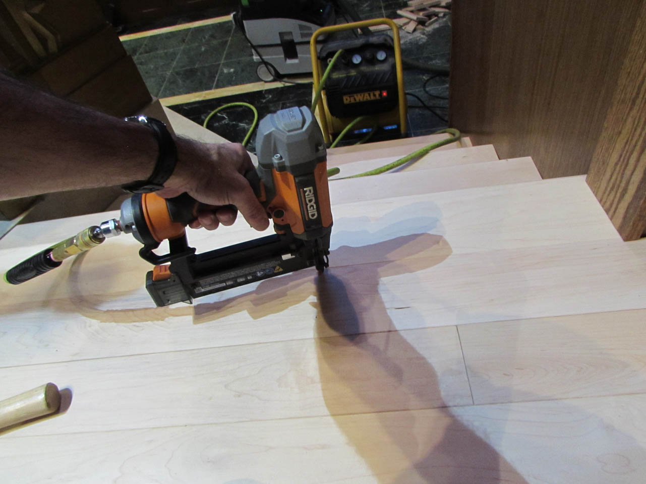 I face-nailed the first edge along the bullnose, then used the flooring nailer along the tongue side.