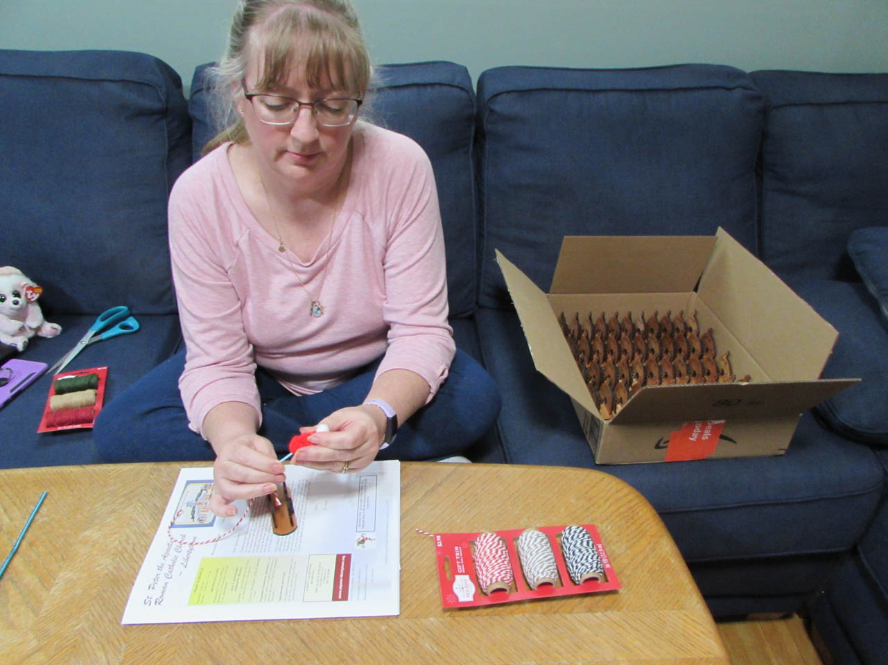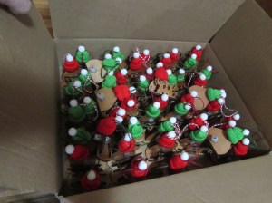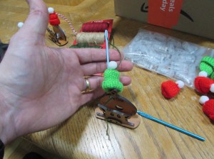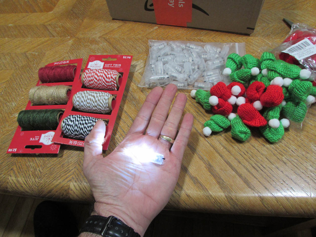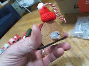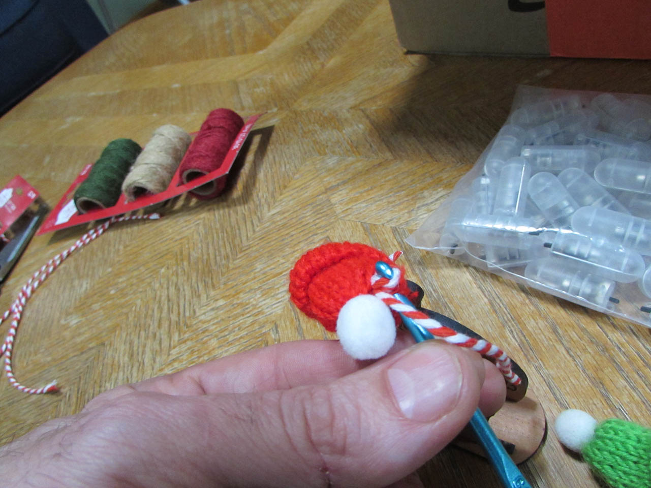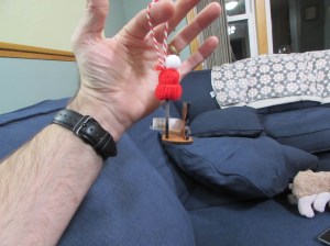 The first one was a success but we needed a different way to feed the string through the hat. Note that with the light hanging out the back and the hat centered above, the ornament hangs perfectly balanced so that it doesn’t tip forward or backward.