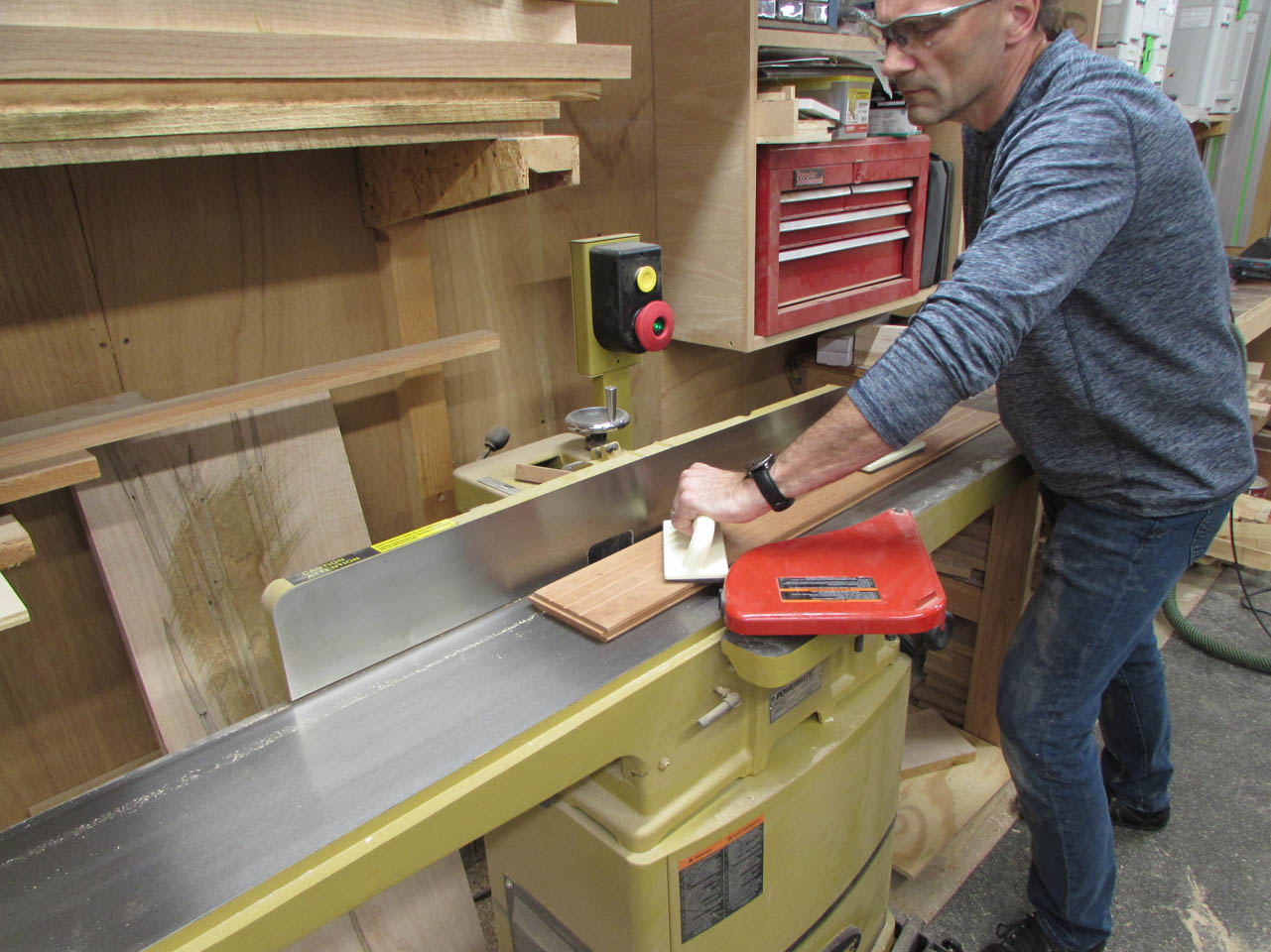 Cherry has a nice pink-red color that works well for piggys especially since it will darken over time. I need several pieces cut down to about 1/8″ thick so that I can easily laser through it. I have some left-over cherry flooring with nice straight grain that will work perfectly.