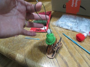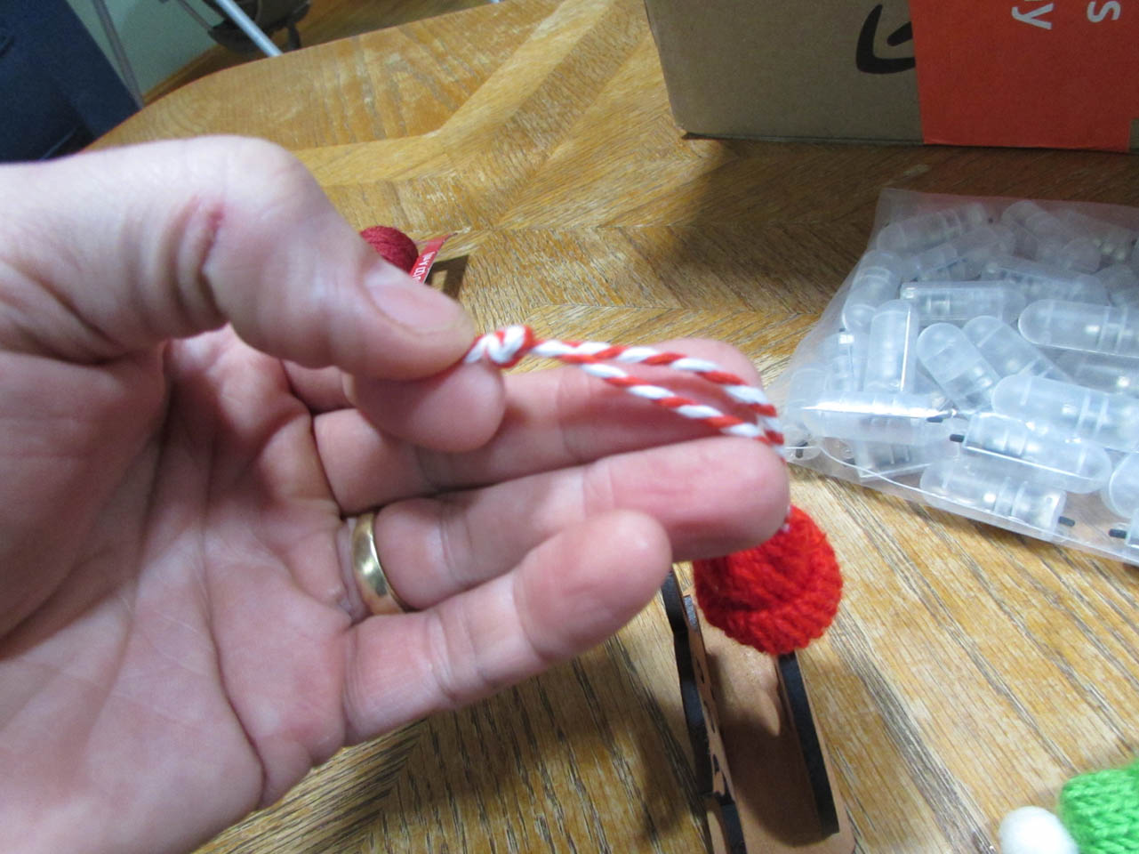I figured the tail would be the best place to hang the string. Originally I was planning to glue the hat to the head, but I decided to feed the string through it and place it on the tail to hide the knot in the string.