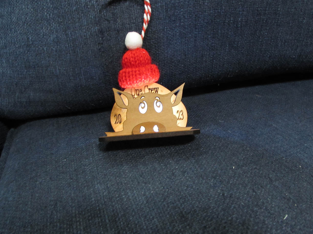 For the last couple of years, my wife and I have been making piggy ornaments as gifts for the staff of a local barbecue restaurant, Carterque, that we frequent. We have been acquiring components that we thought we could use this year, so I finally came up with an ornament that would use all the stuff. We had a selection of string, a bag of tiny Santa hats, and a bag of balloon lantern lights. We need about fifty so I decided to use the laser for most of the work.