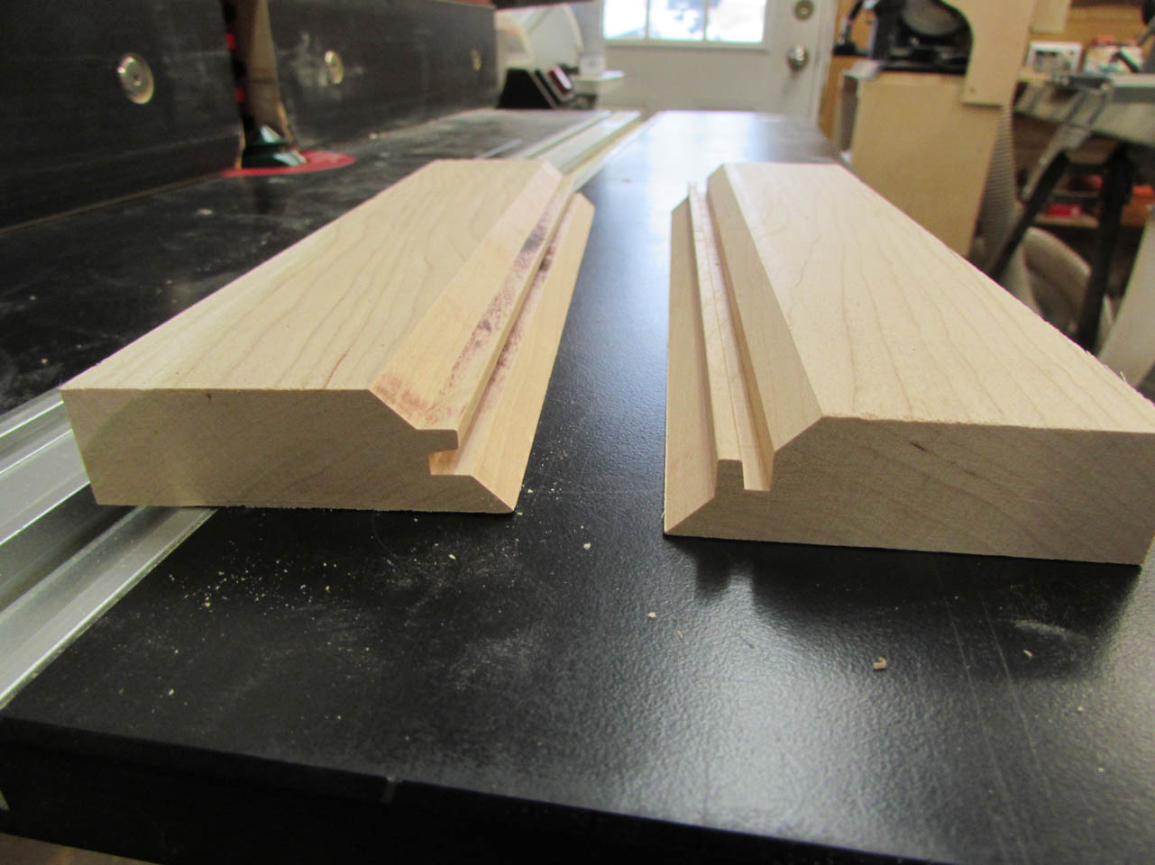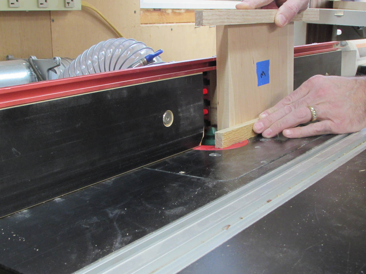 One piece is cut vertical against the fence and the other is cut laying flat.