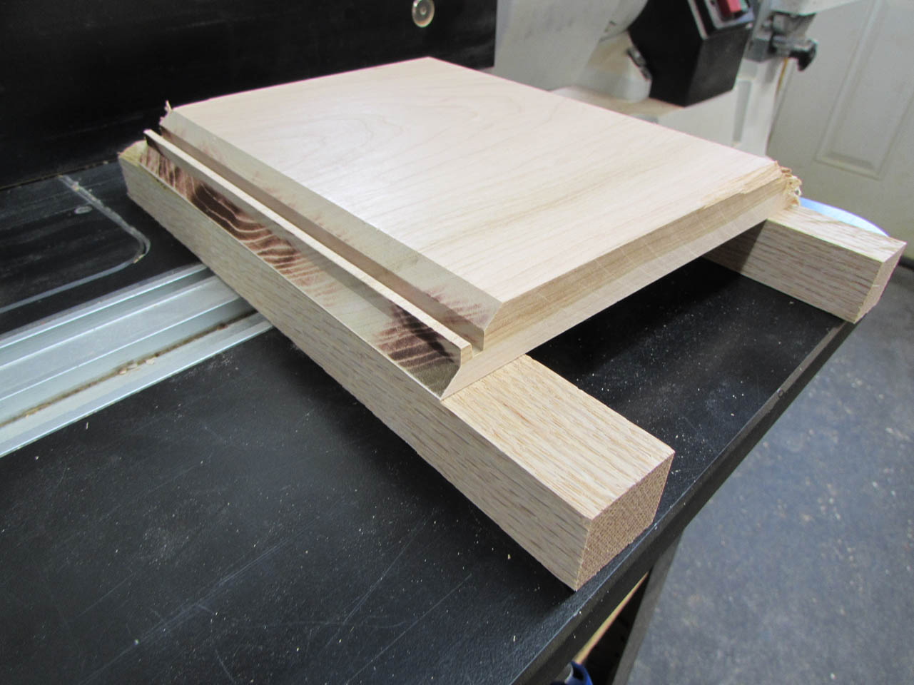 I cut the board in half on my cross-cut sled, then stacked the two pieces to cut the individual sides to equal lengths.