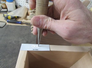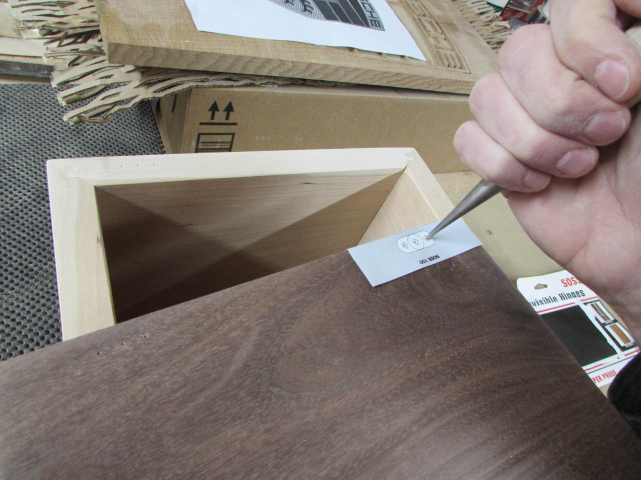I have some hidden hinges to install along the back, so I cut out the template and lay it in place to mark the hole locations for drilling.