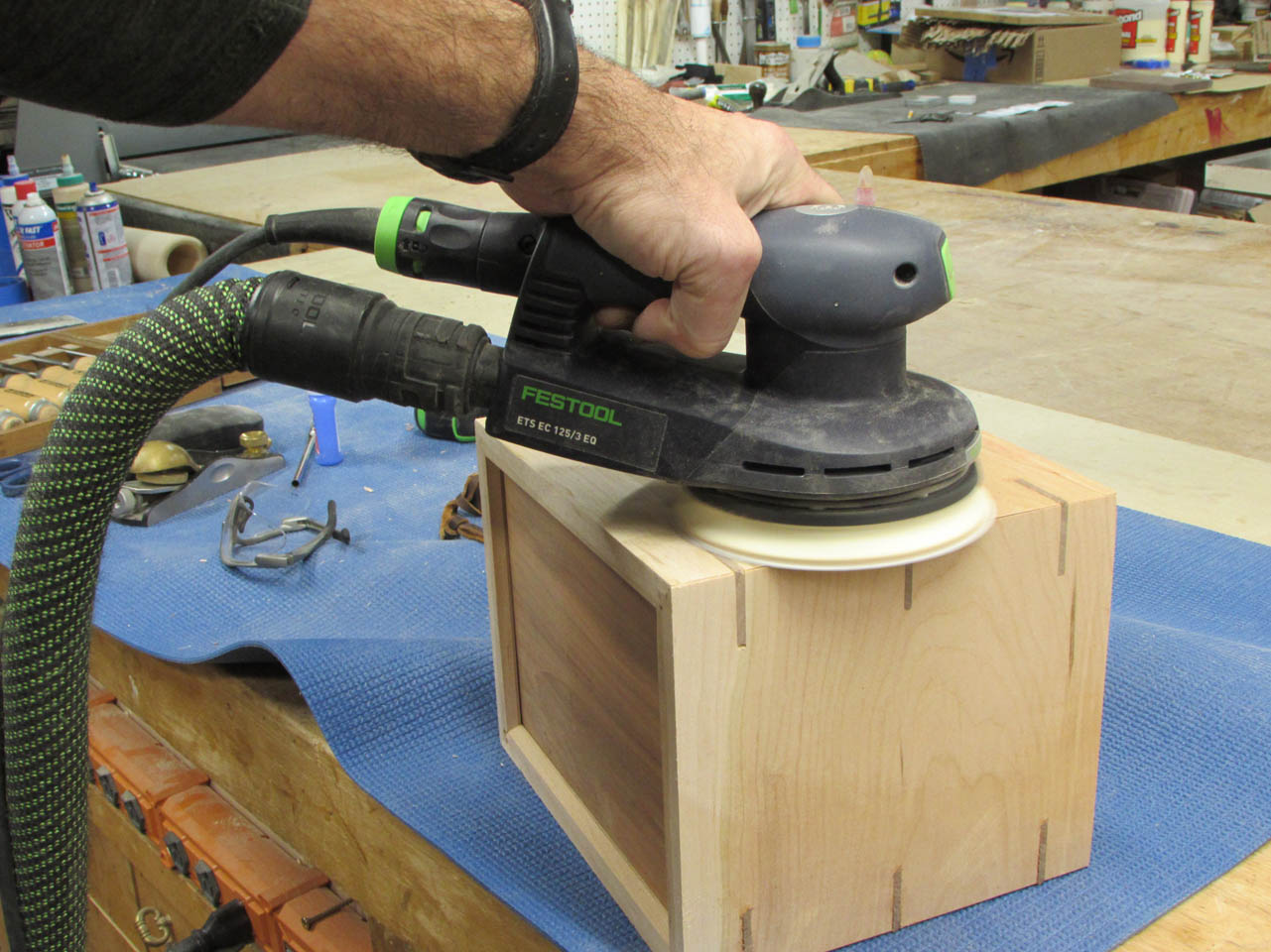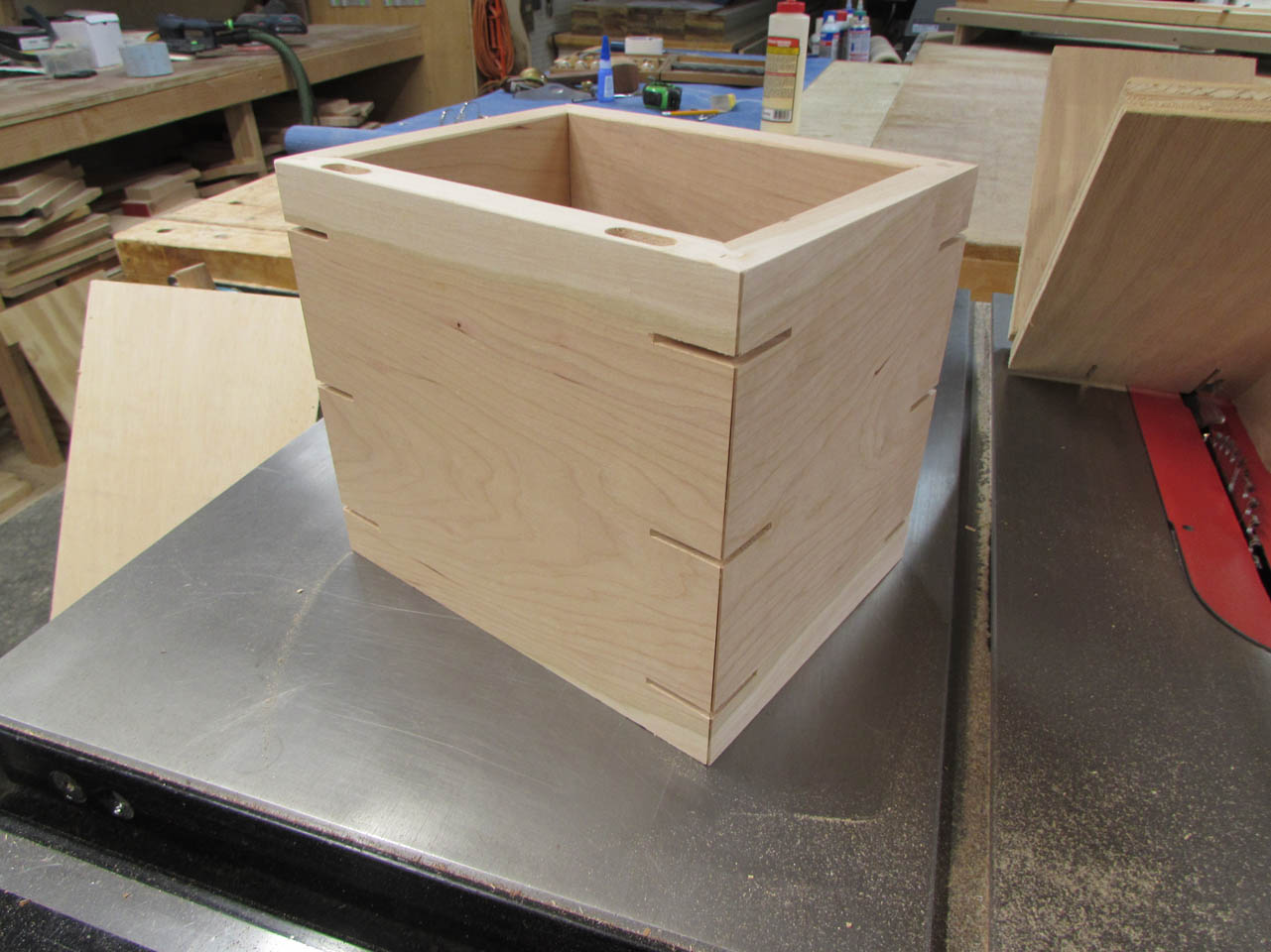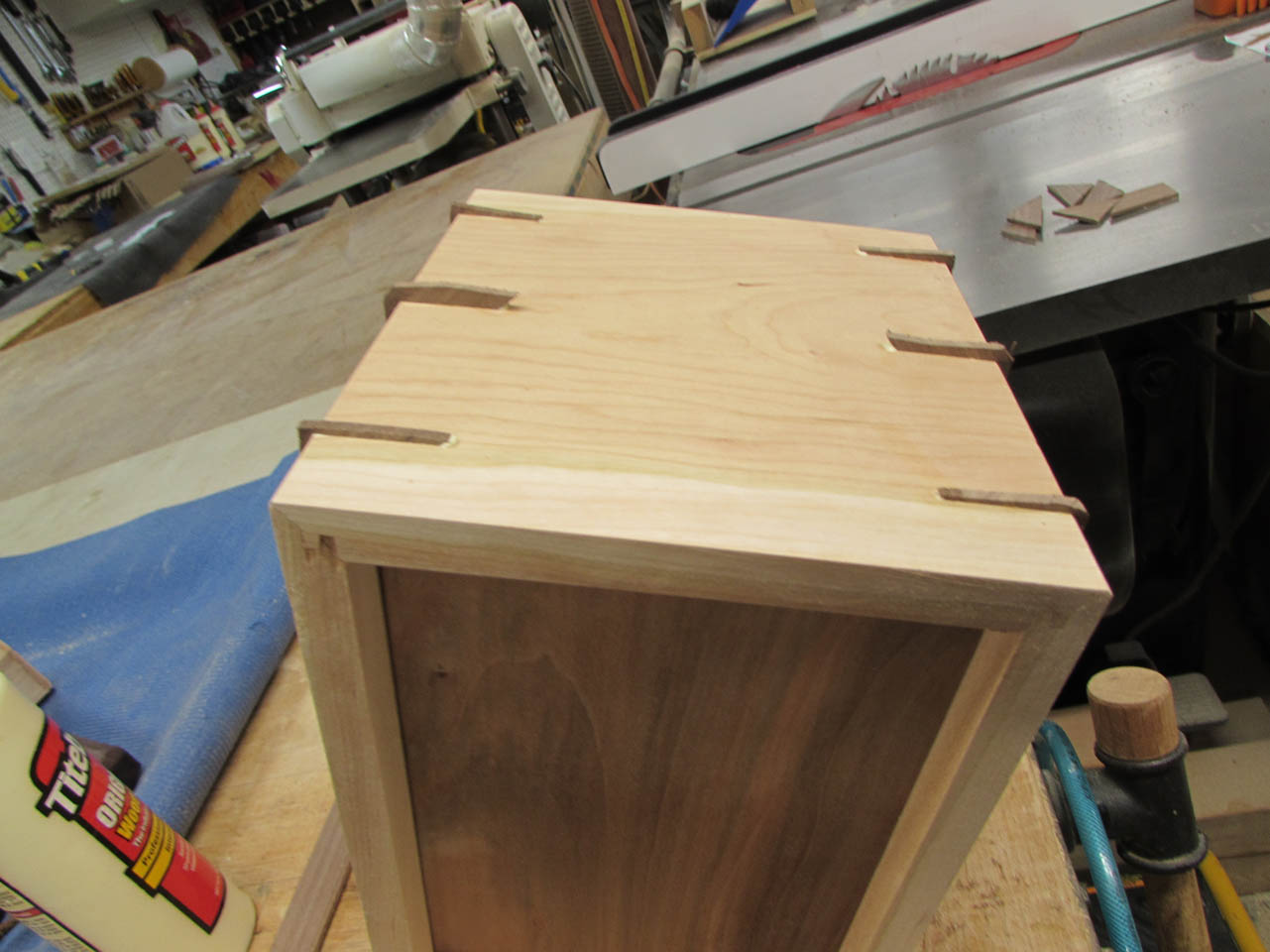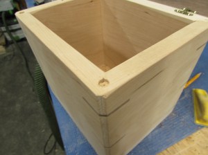 I sanded all the splines flush then cut a chamfer along each edge to match the one on the bottom as well as the lid of the box.