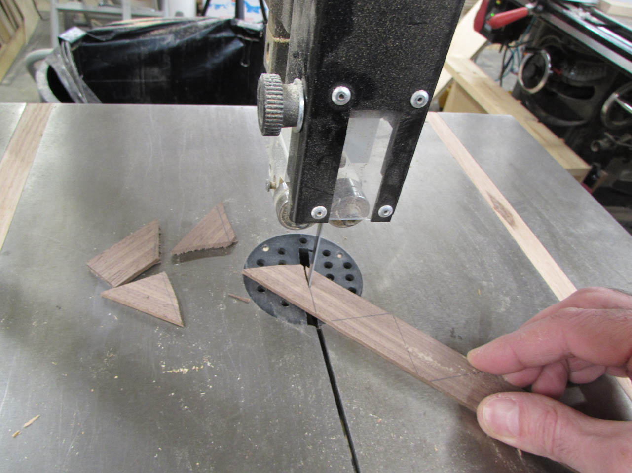 After marking the approximate size of each spline, I rough cut them out on the band saw.