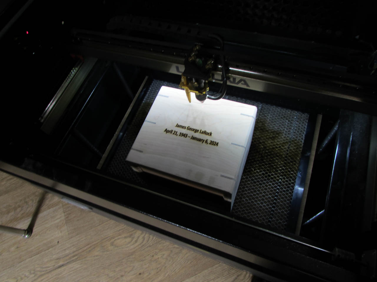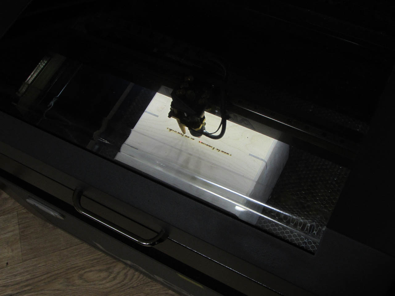 Happy with the size a depth of the engraving, I loaded the box into the laser and lowered the table.