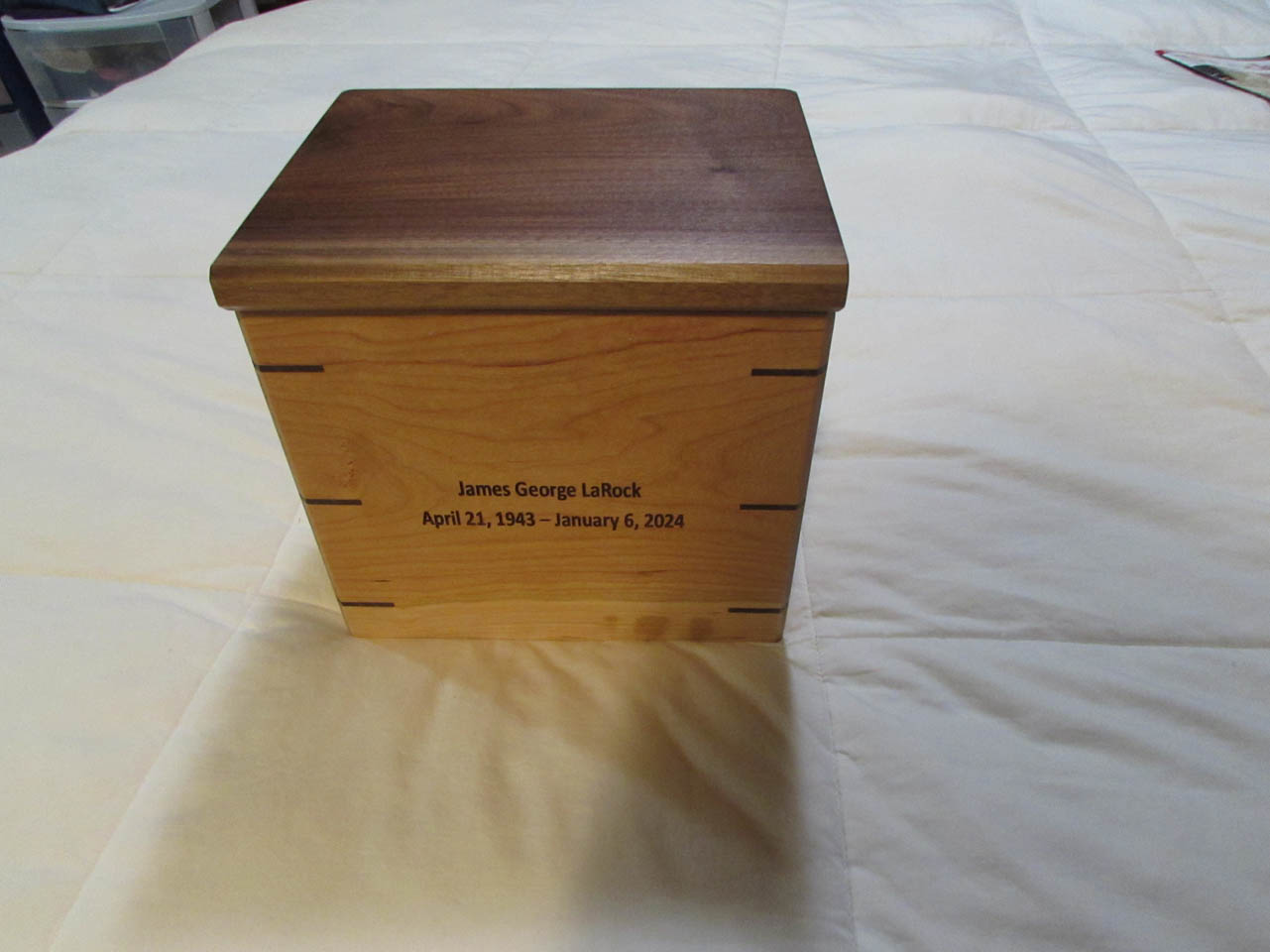 Jim’s name and dates were engraved onto the front of the box.