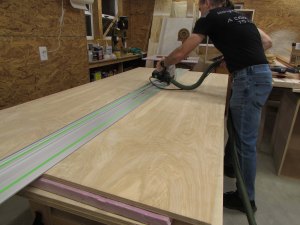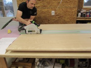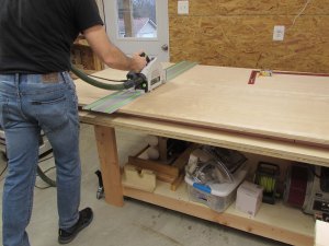 I am starting the project by breaking down a few sheets of 3/4″ plywood with my track saw. I laid 2″ thick foam board on the assembly table so that when I cut through the plywood, it cuts into the foam and not my new table. I cut down the first two sheets to get the parts for the two smaller cabinet boxes.