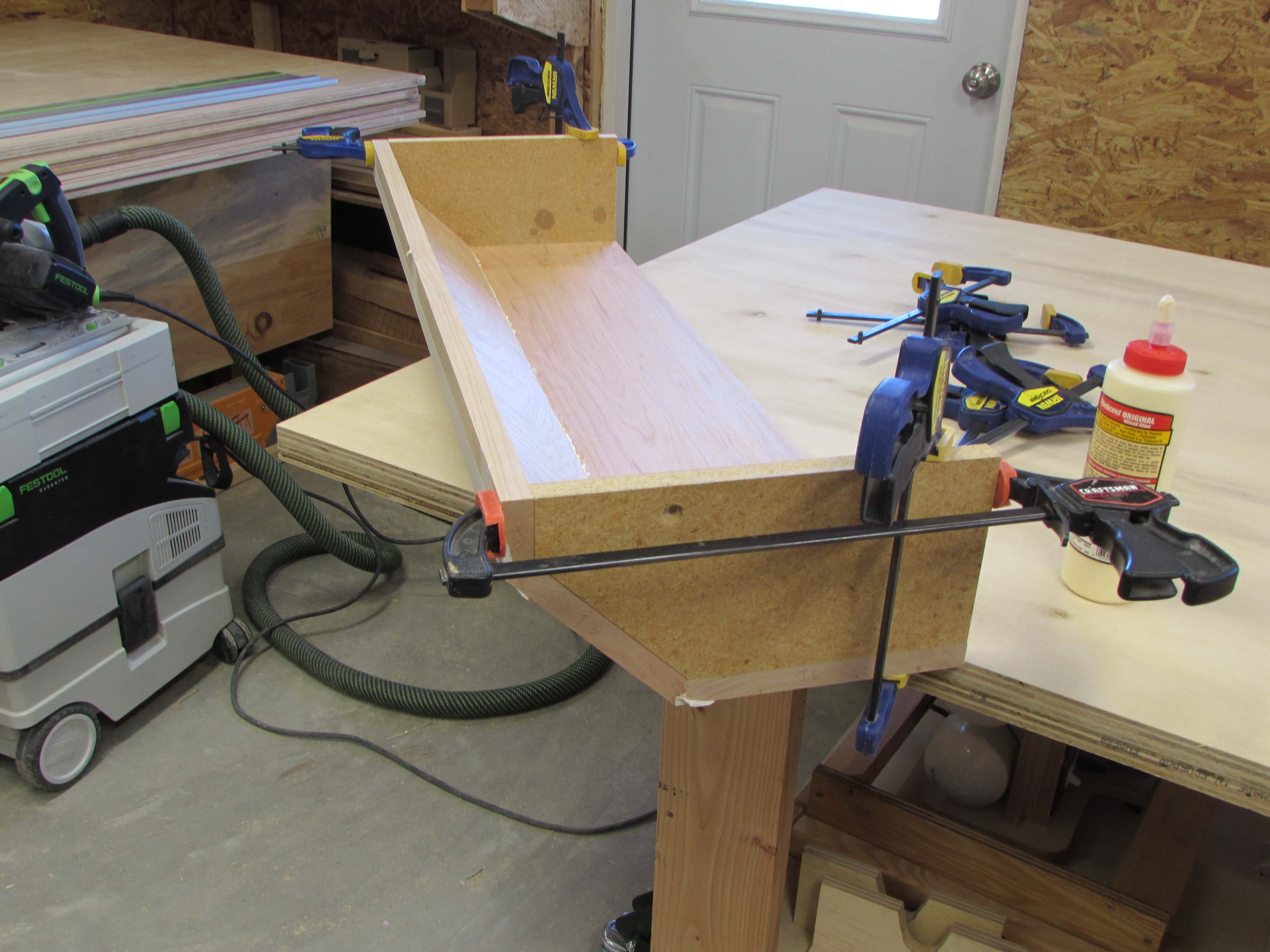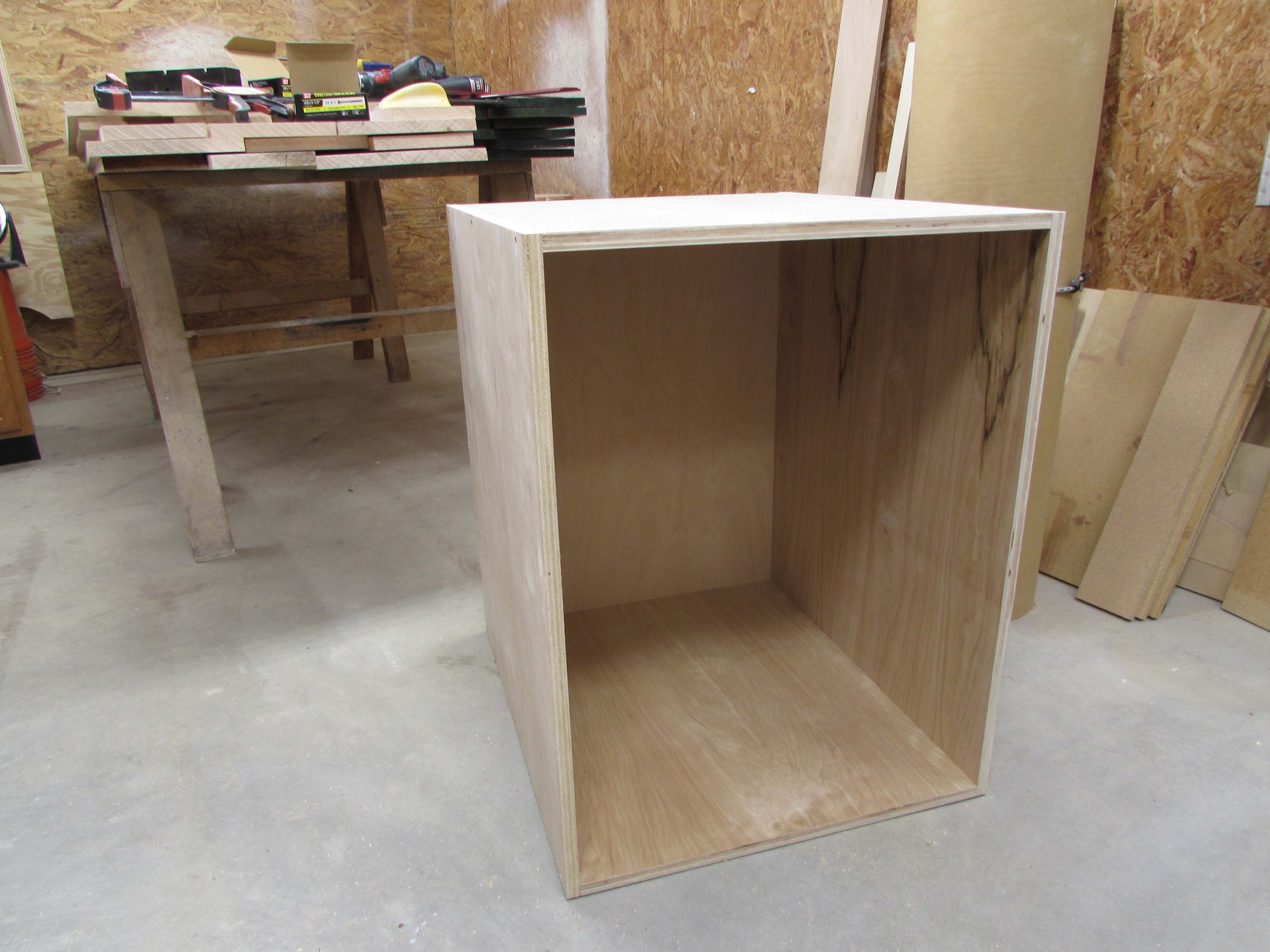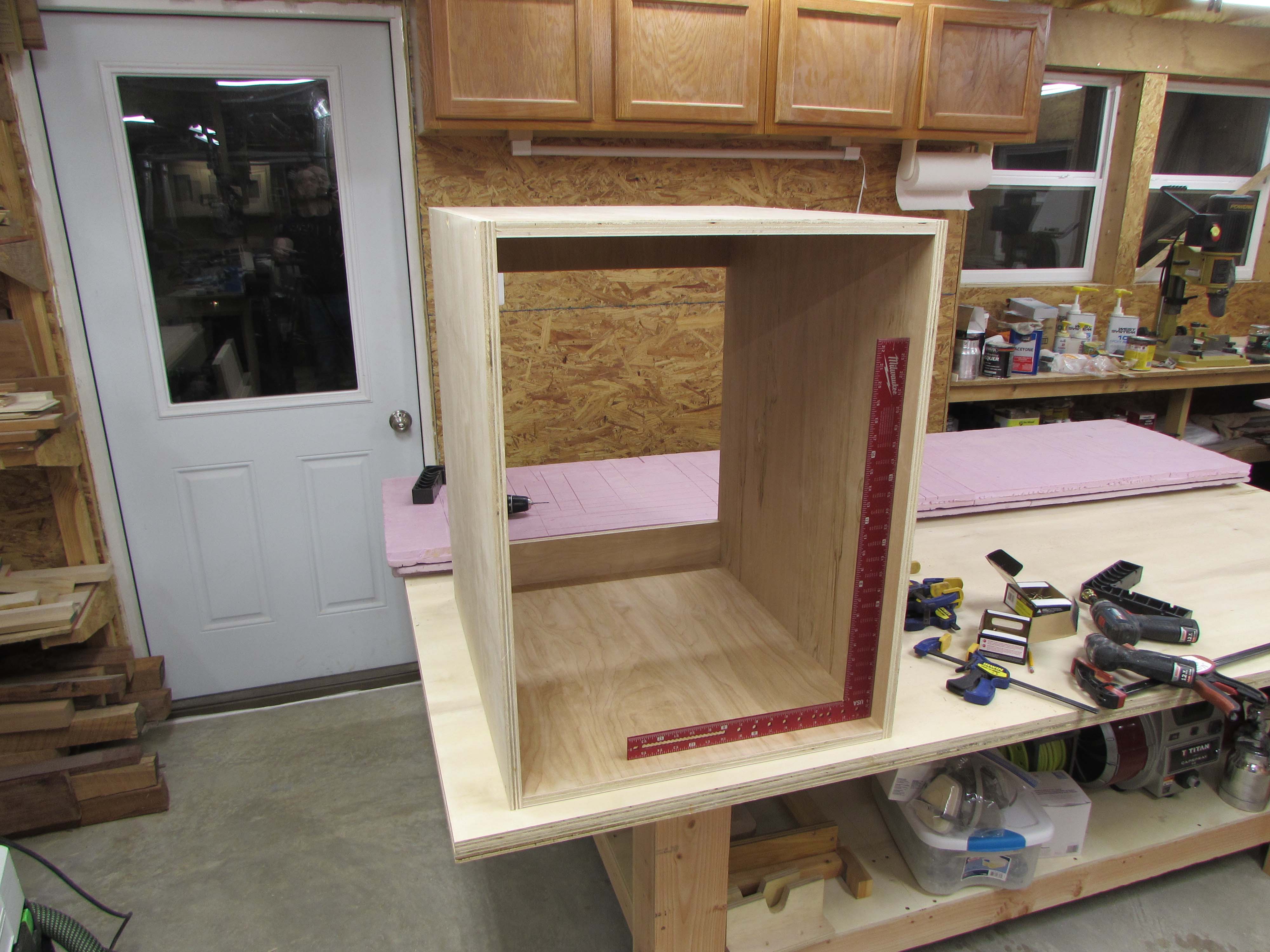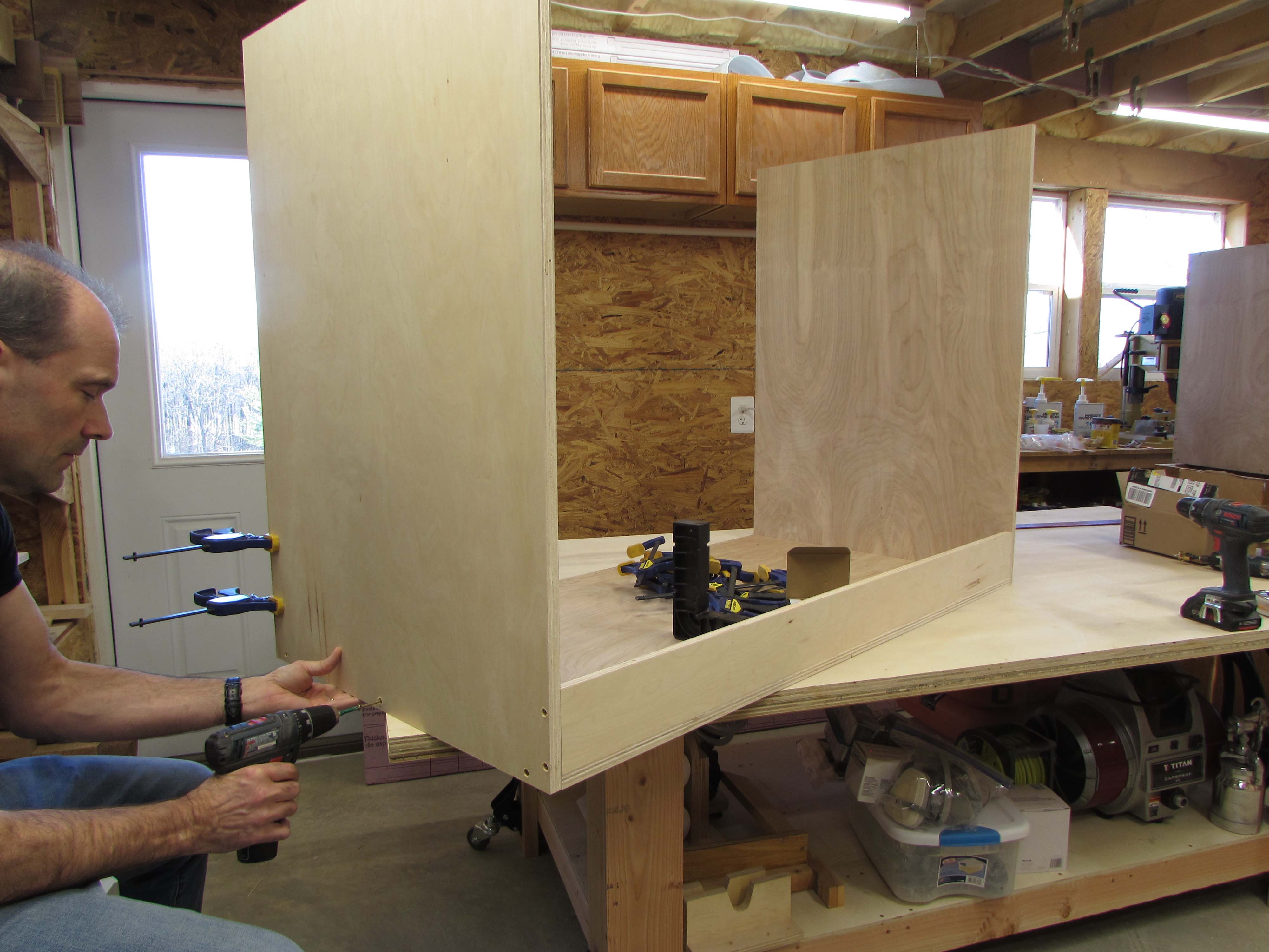 Box assembly is straight forward. I am clamping the corners square and pre-drilling, then screwing the plywood sheets together.