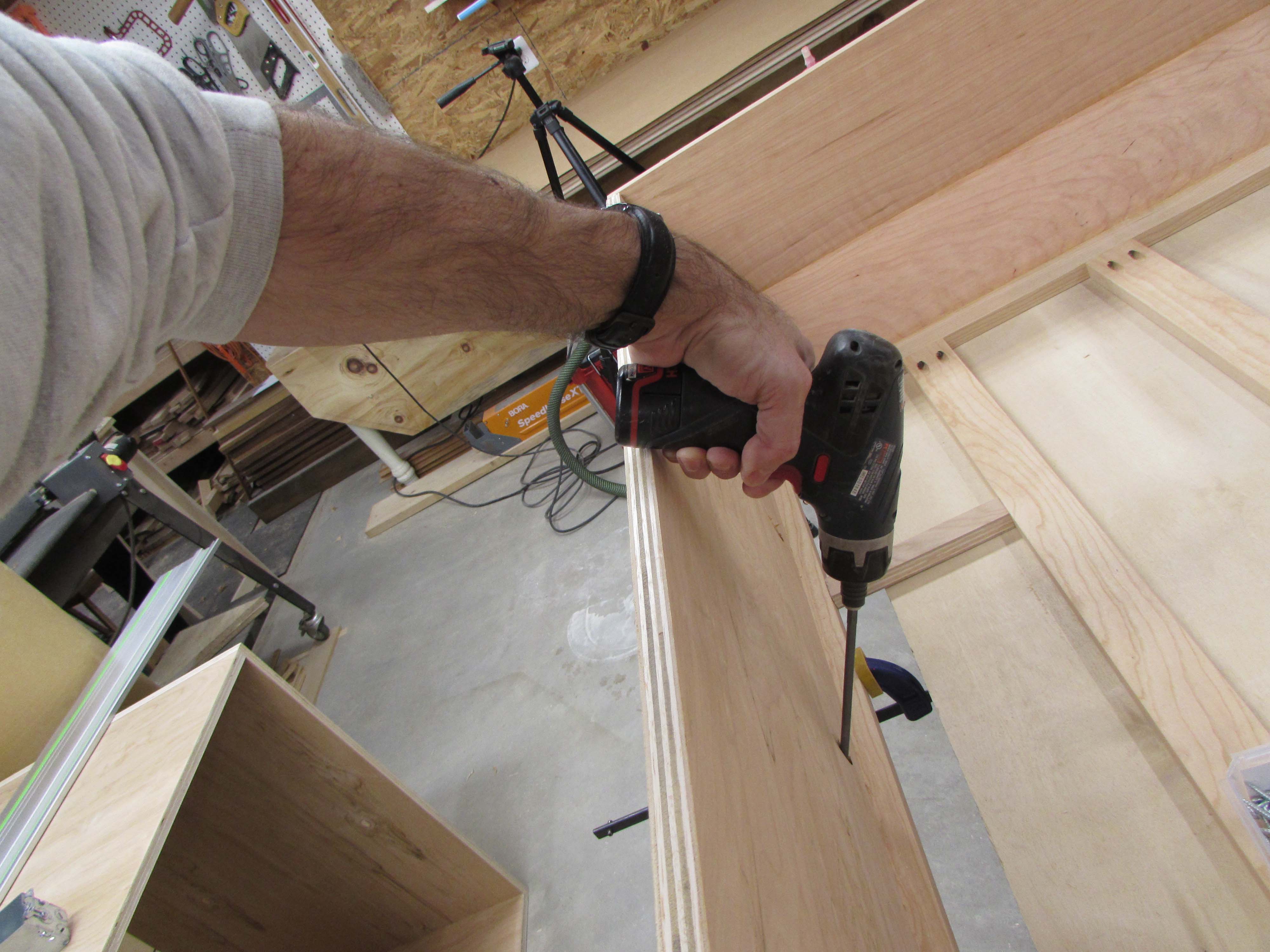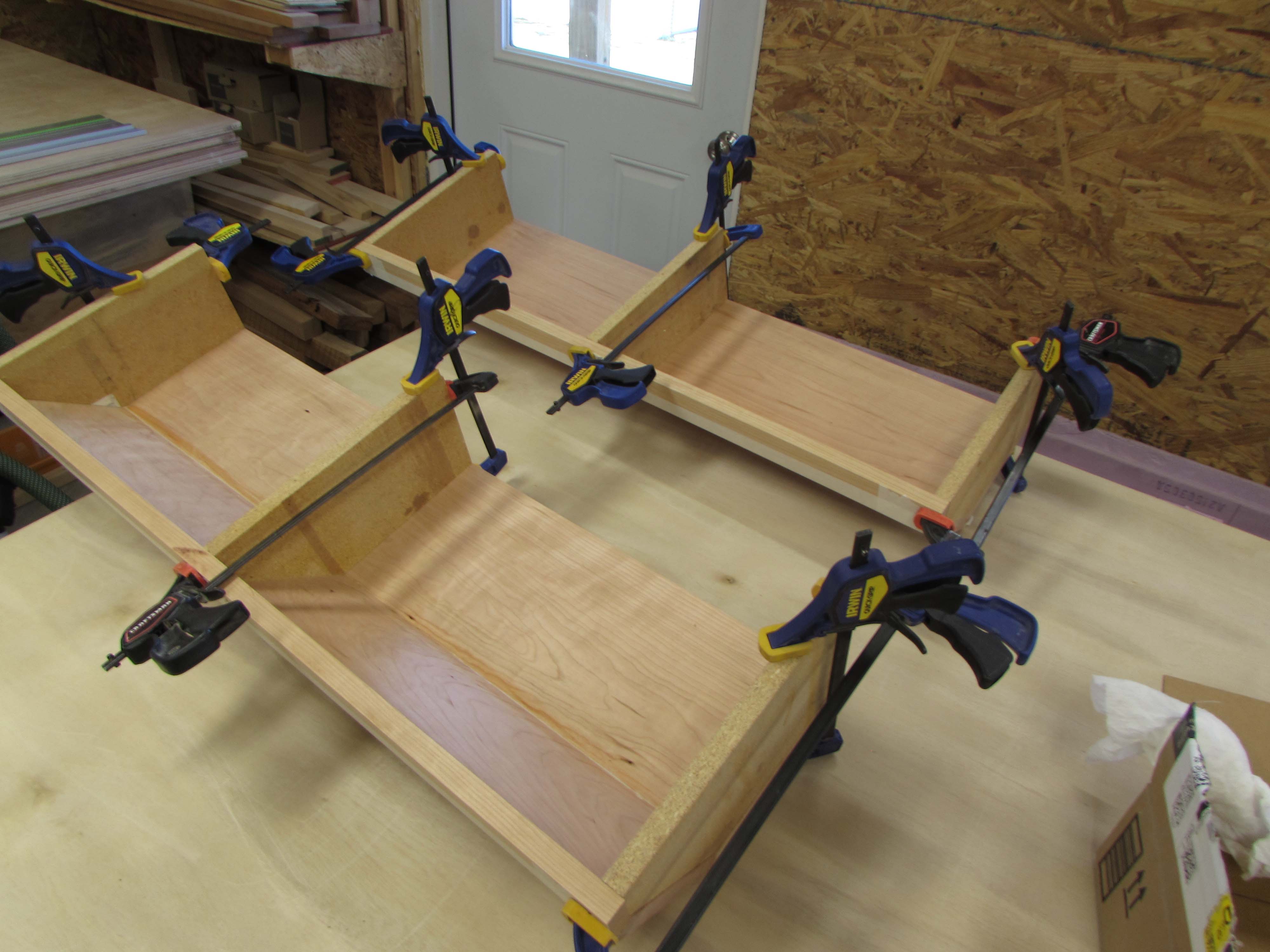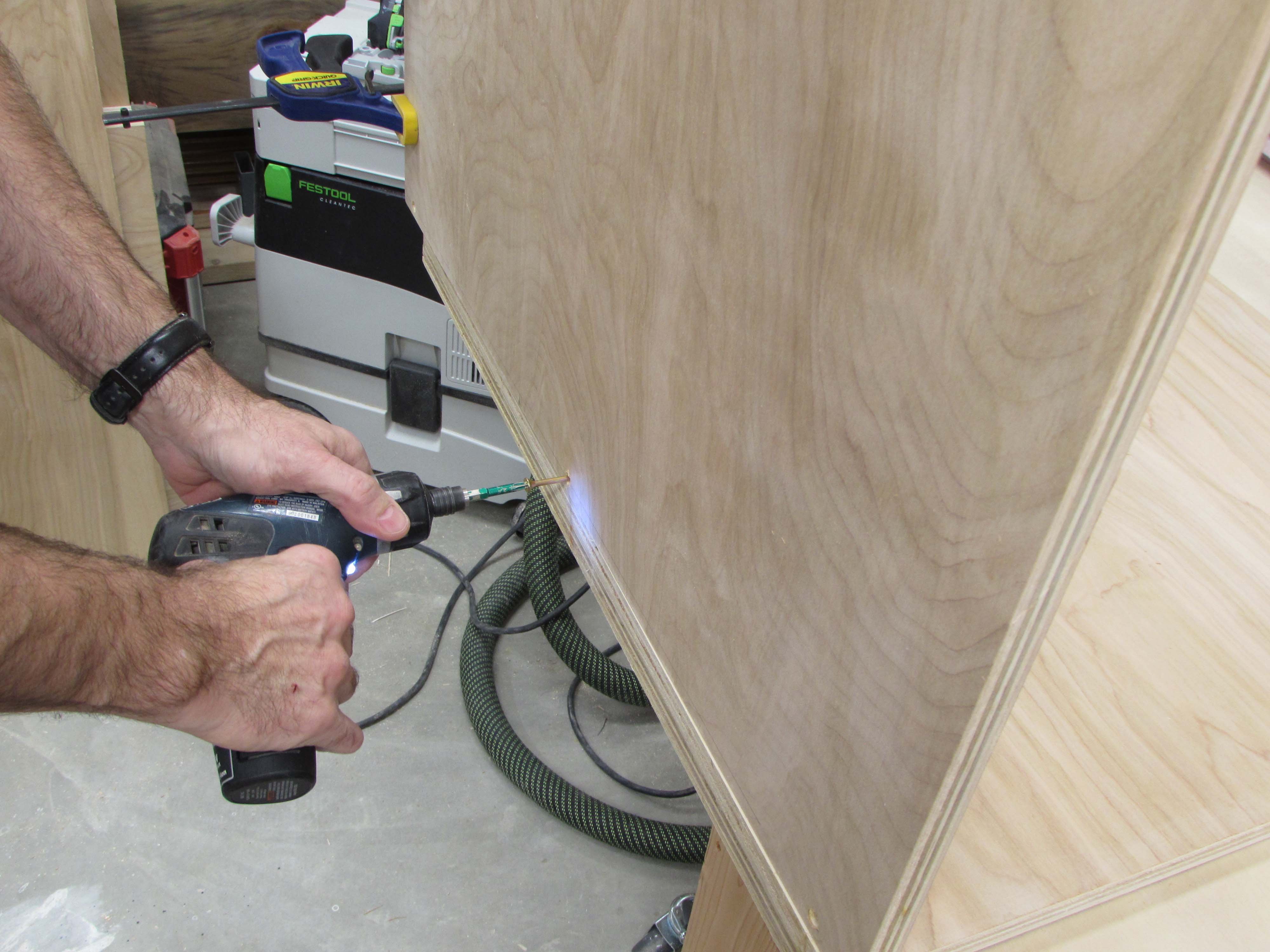 Box assembly is straight forward. I am clamping the corners square and pre-drilling, then screwing the plywood sheets together.