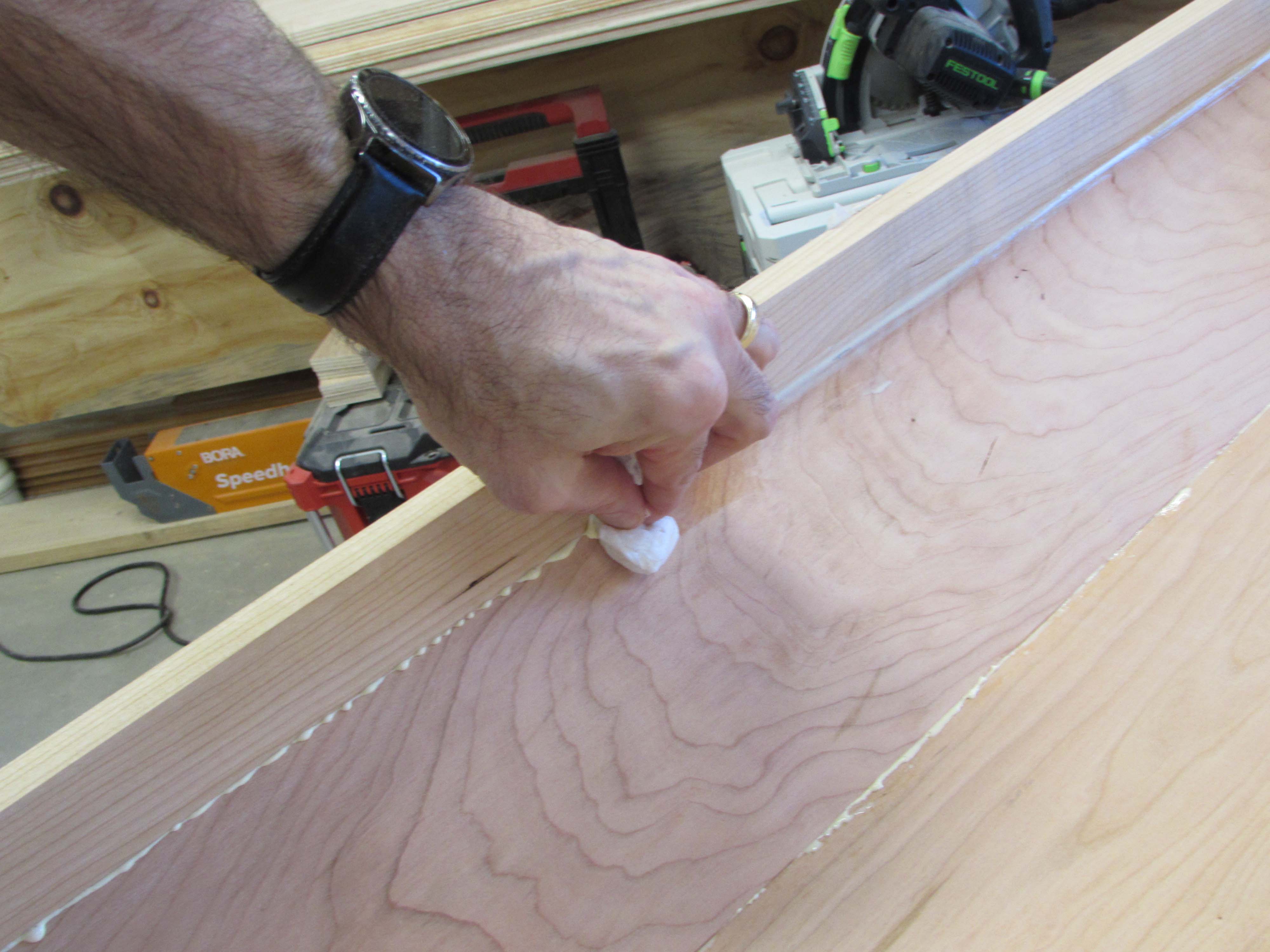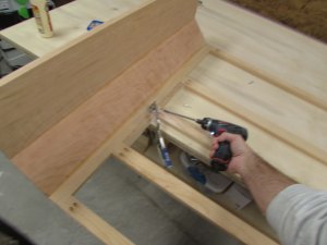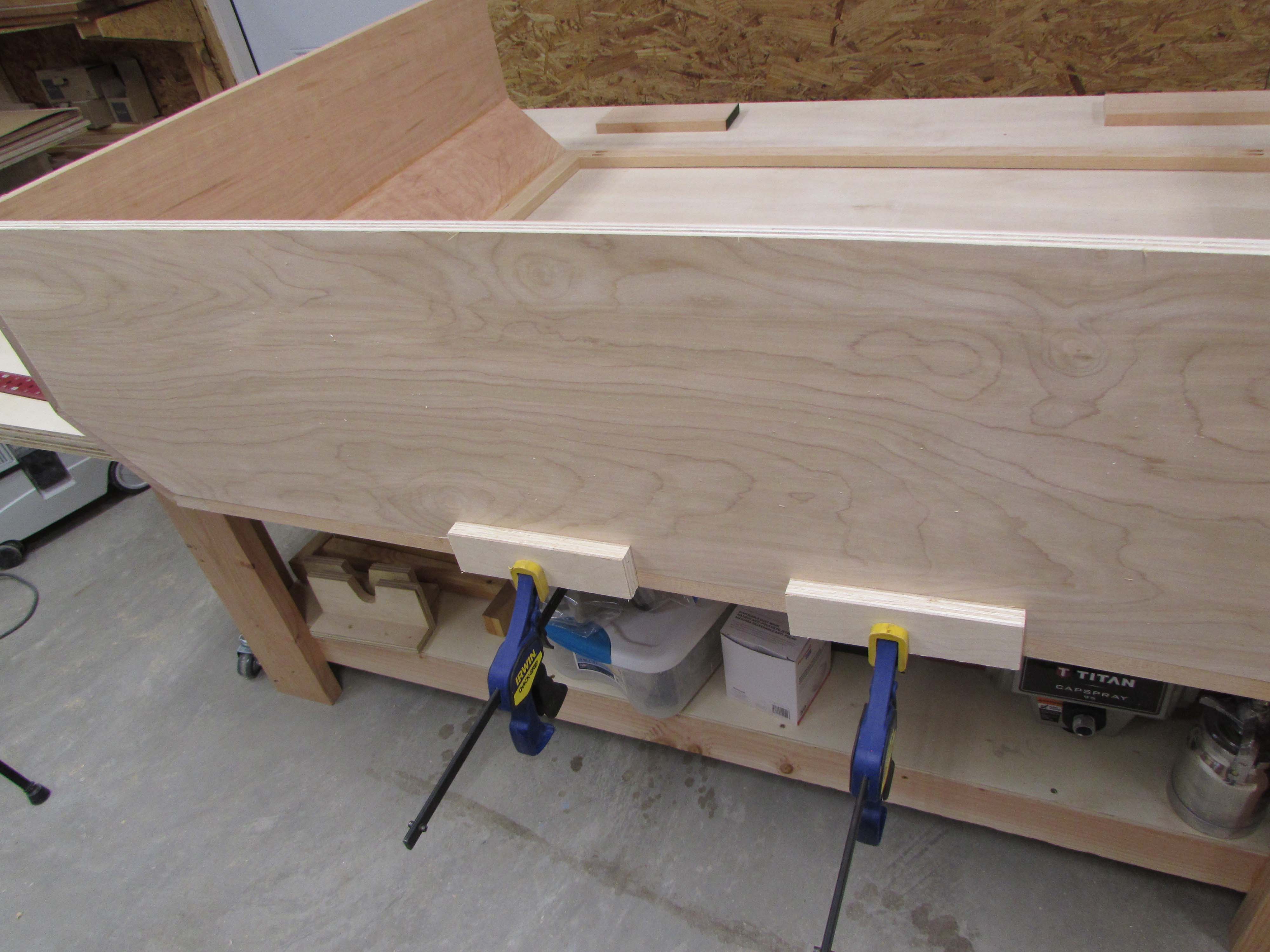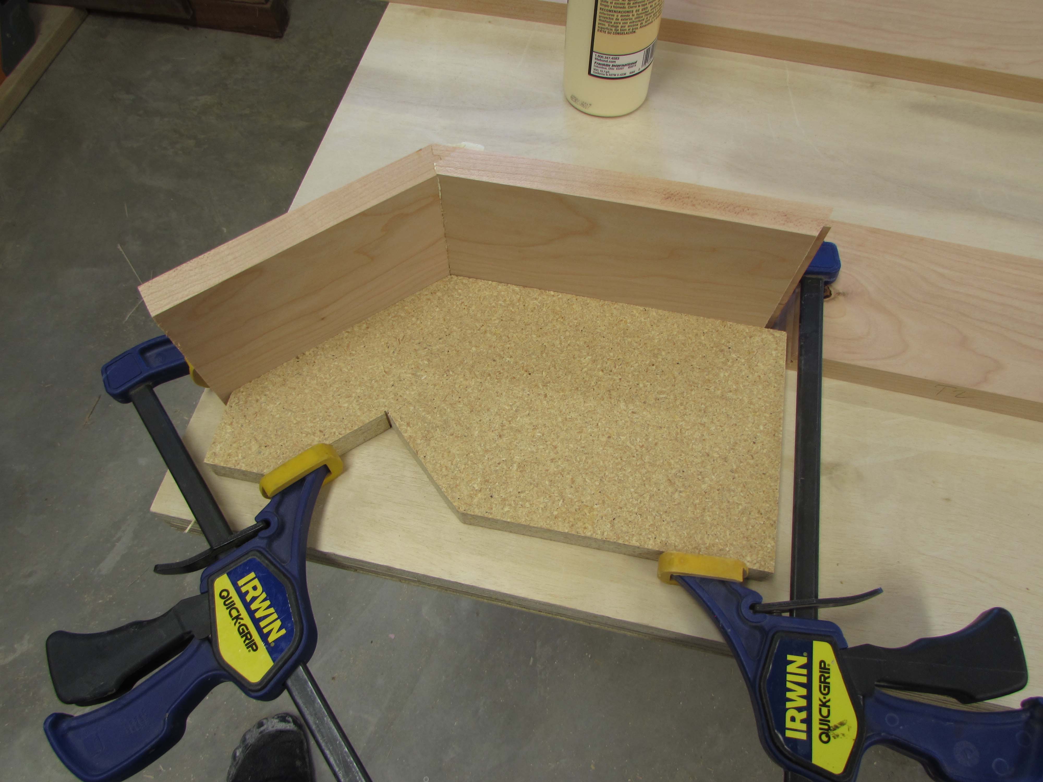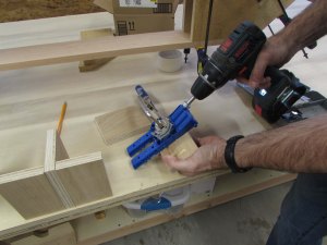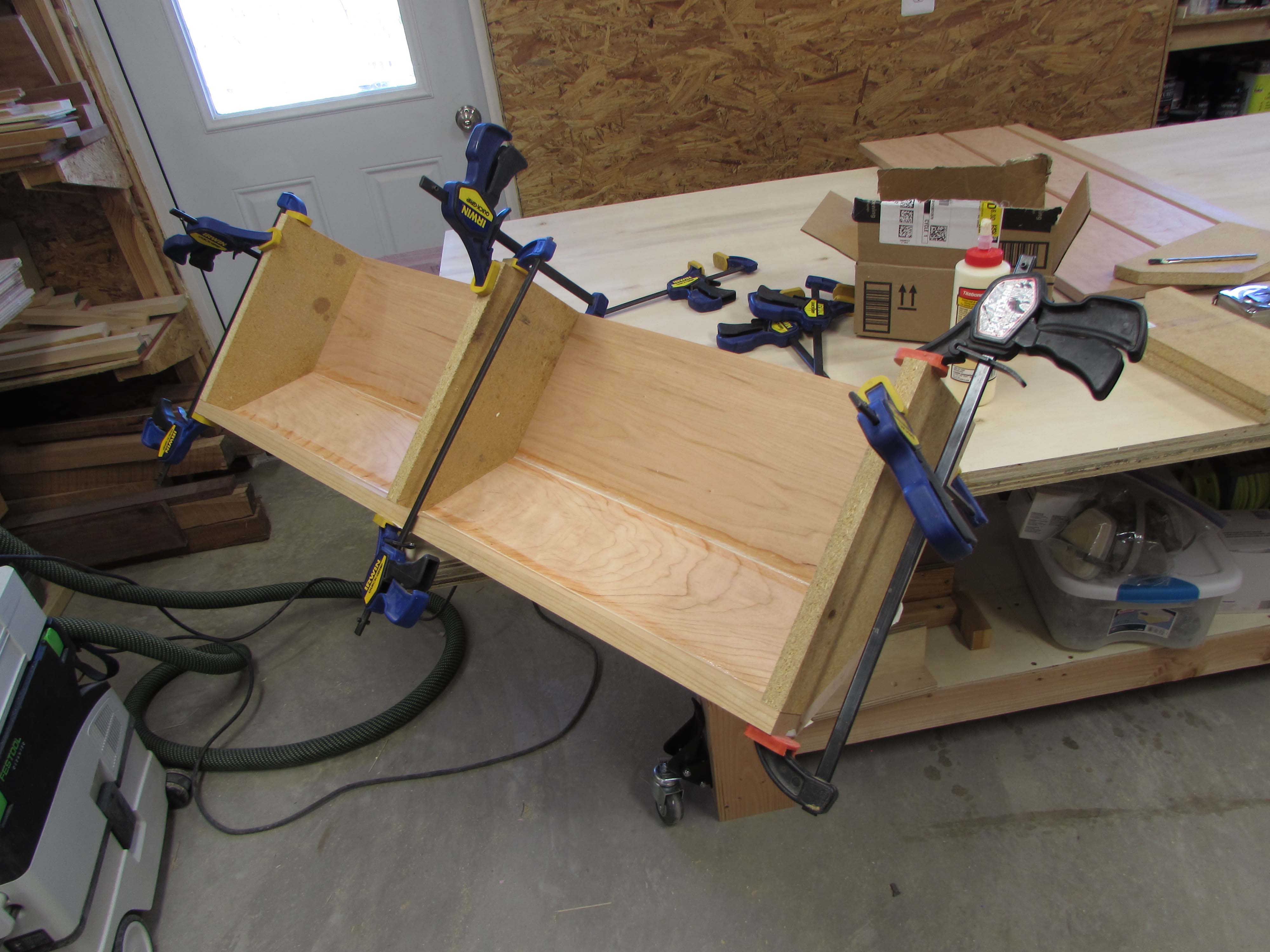Box assembly is straight forward. I am clamping the corners square and pre-drilling, then screwing the plywood sheets together.