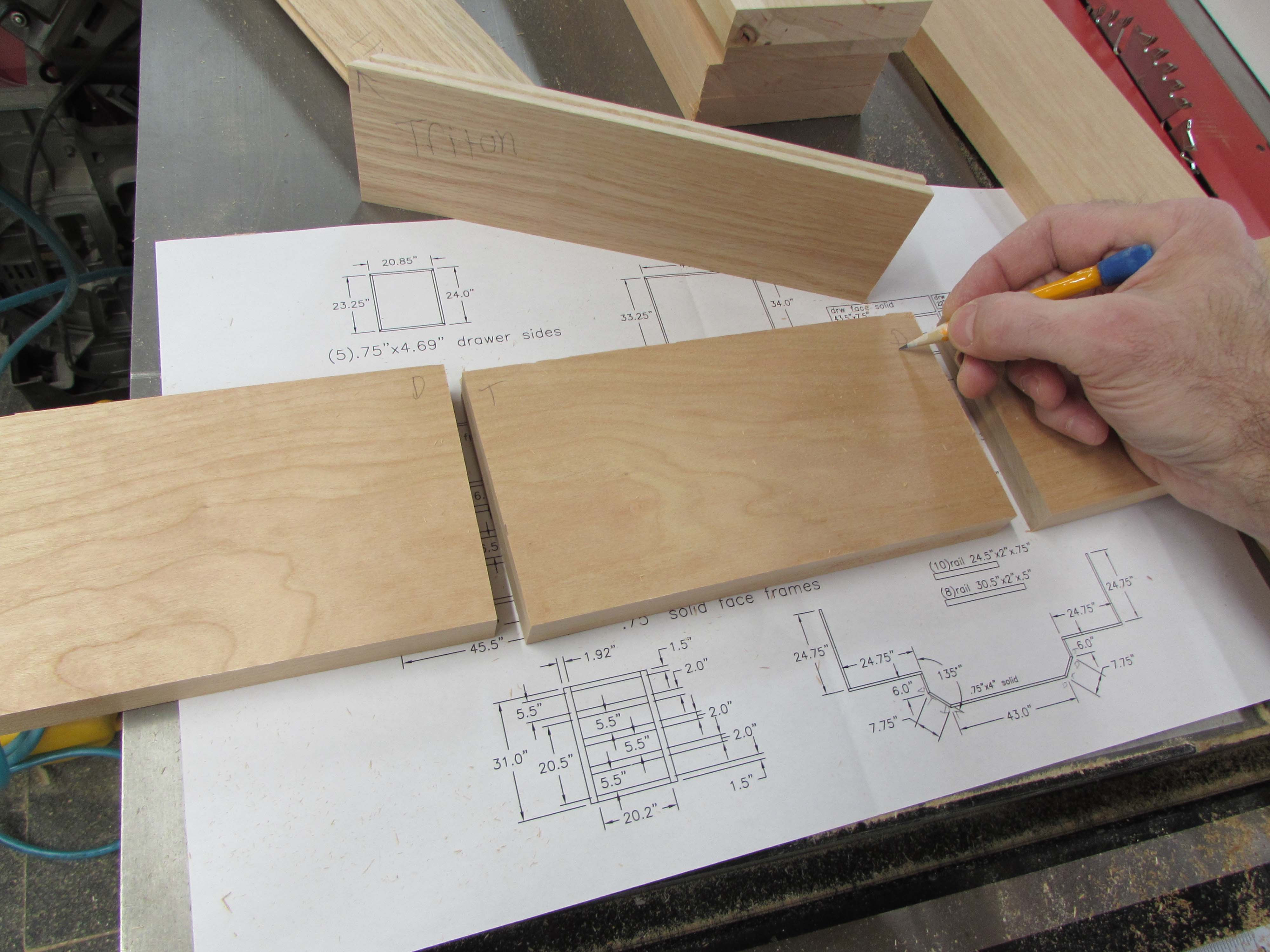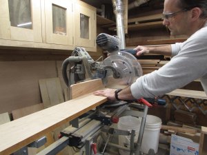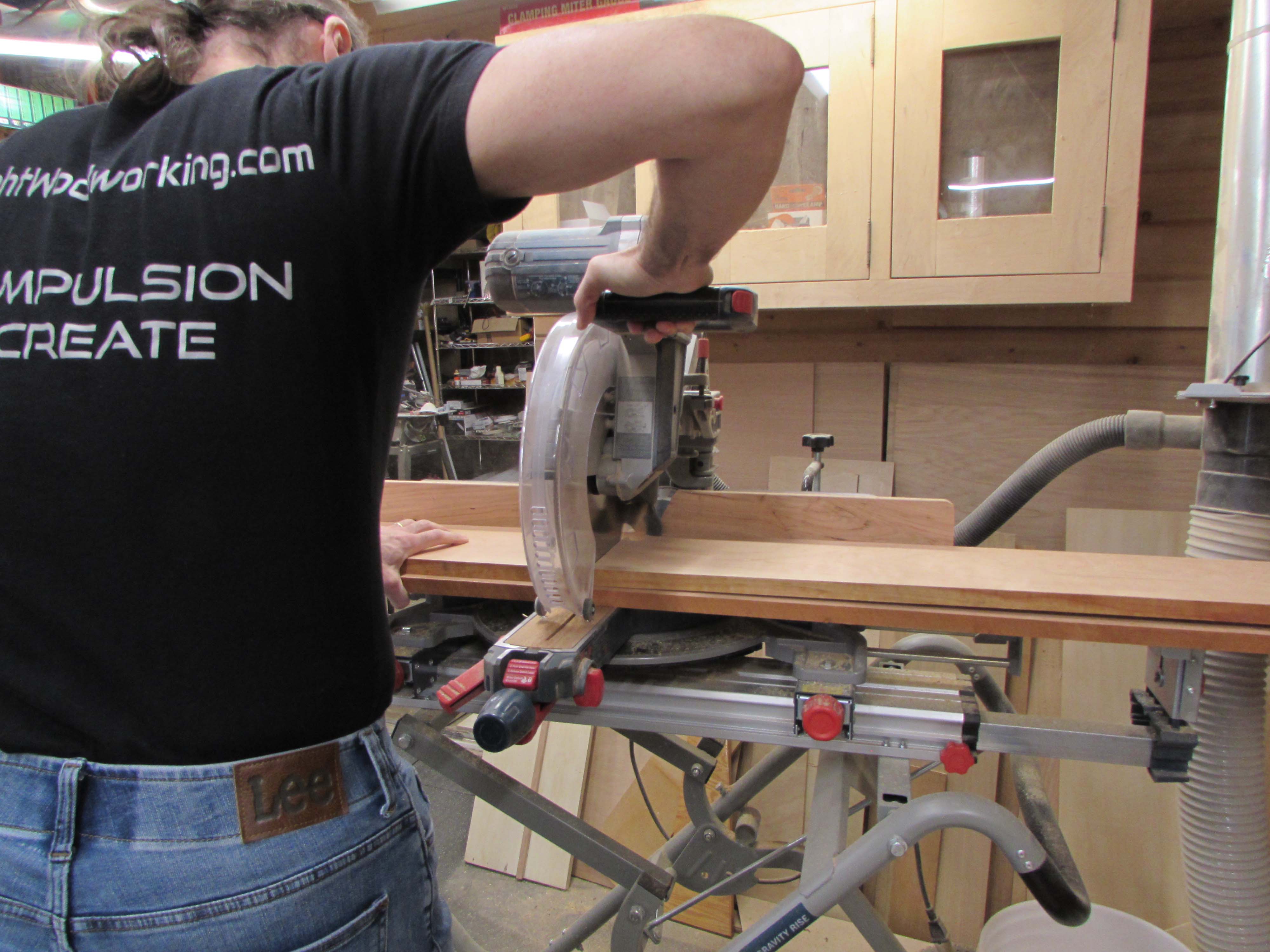 Next up, I am going to cut the cherry rails that will go between the drawers on the front, of the center cabinet. These will be attached between the tall angled sections that I just glued up along with the base.