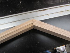 Then I do some test cuts on a couple of scraps. I will need to do the same miter joints on the cherry verticals for the center cabinet as well so I did end cuts as well as test cuts up the sides.
