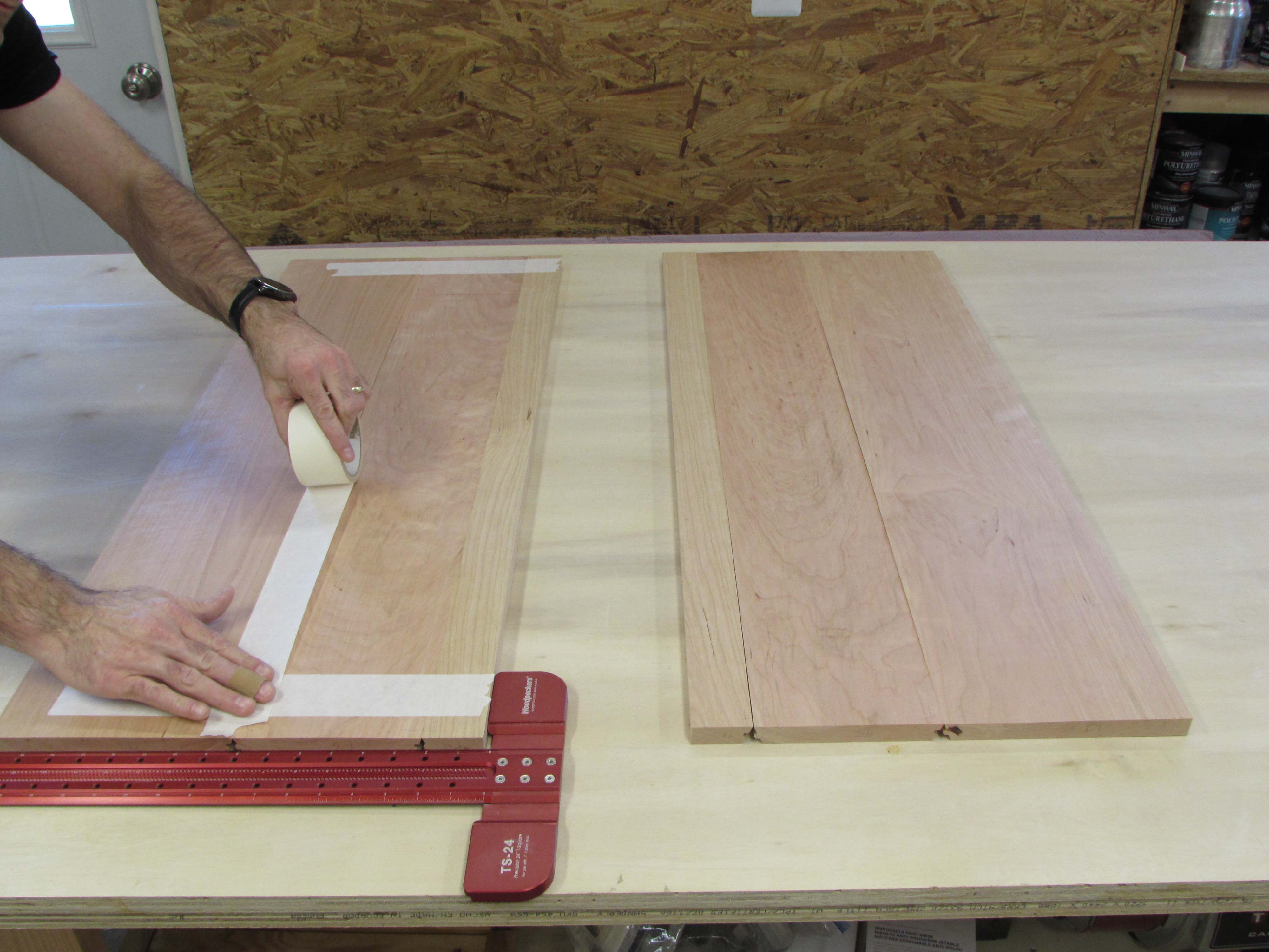 Gluing these is an interesting challenge. I lay the boards face up and butt them together, lining up the edges. Next I tape all the seams to create a hinge.