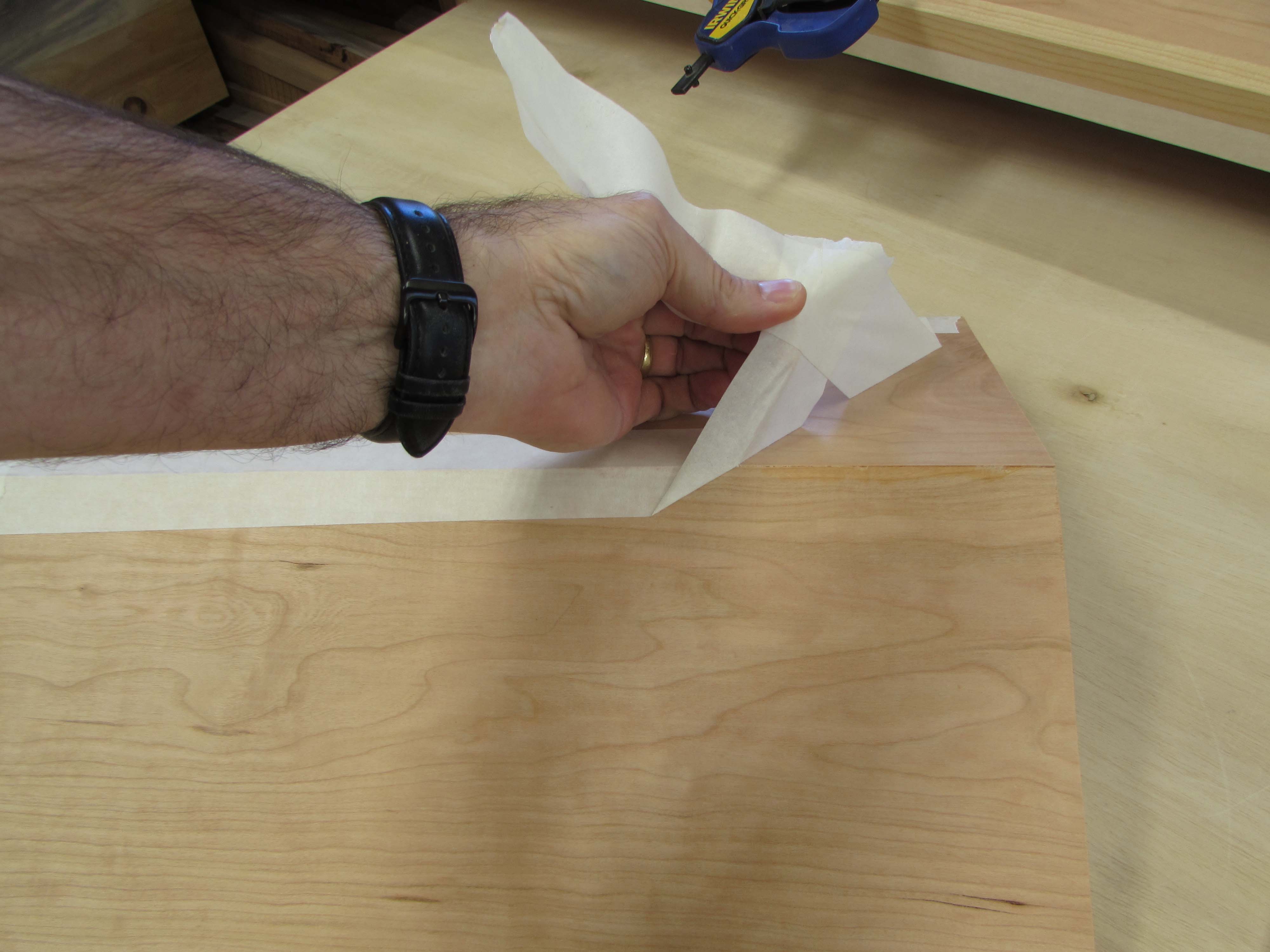 Parts of the cabinet will be visible after assembly. These sections will get a cherry veneer attached. It arrives in a roll, so I have to unroll it and weight it down to flatten it out. I am not using it yet, but I want it to acclimate to the shop so that it doesn’t want to shrink or expand later.