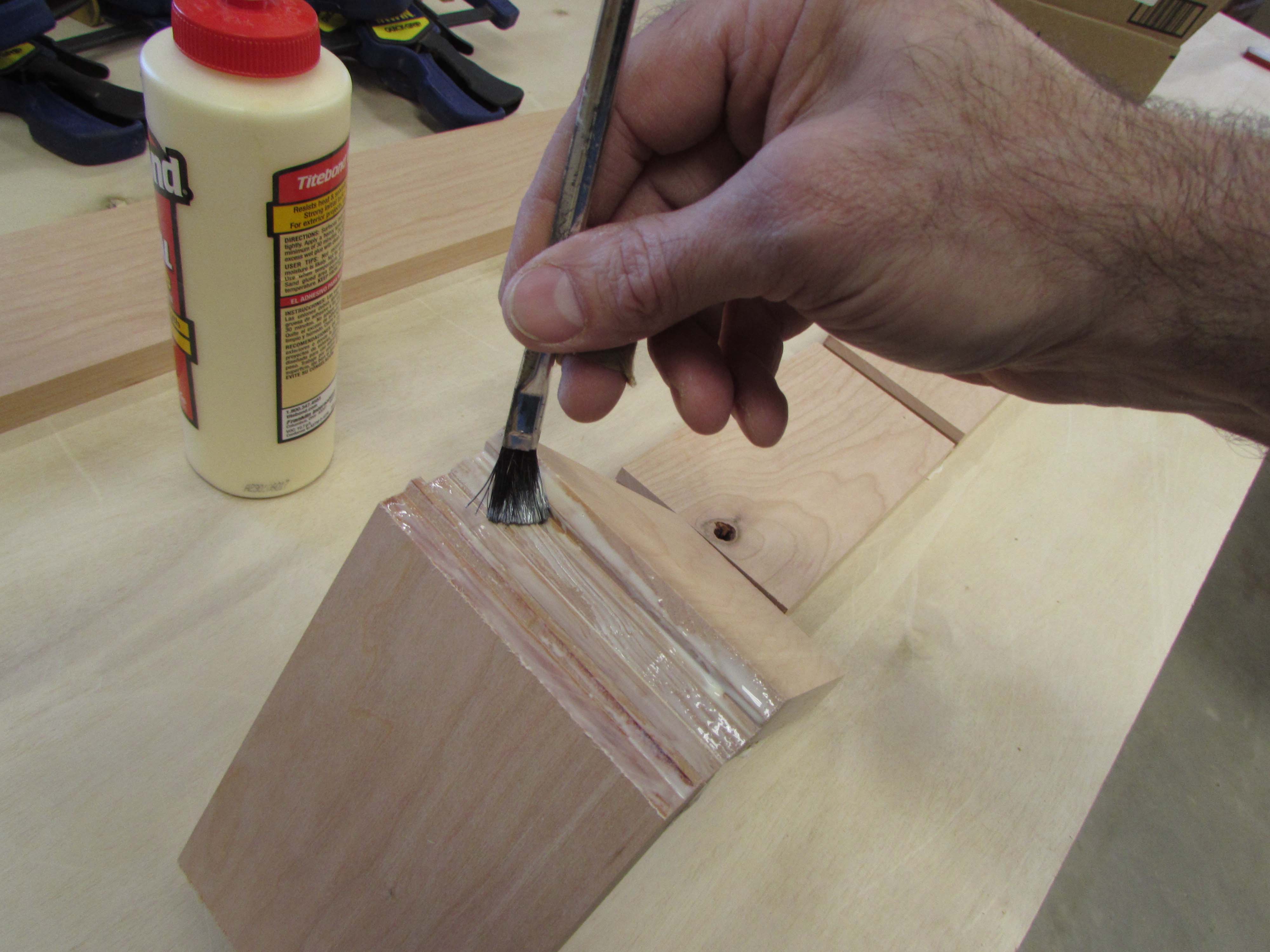 I used an acid brush to get wood glue down into the lock miter grooves, and rolled the sides up and clamped them to the forms.