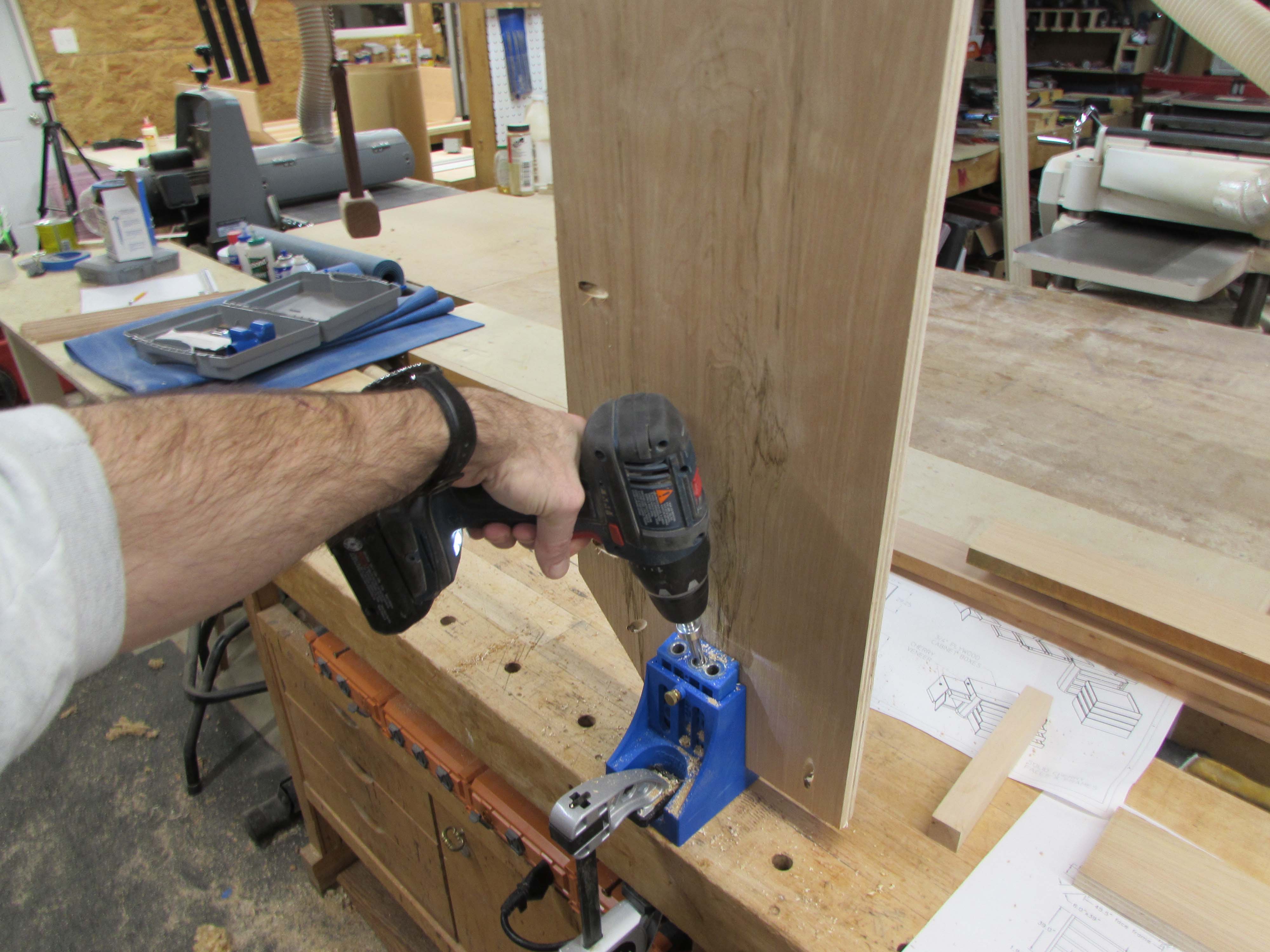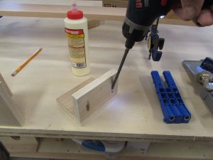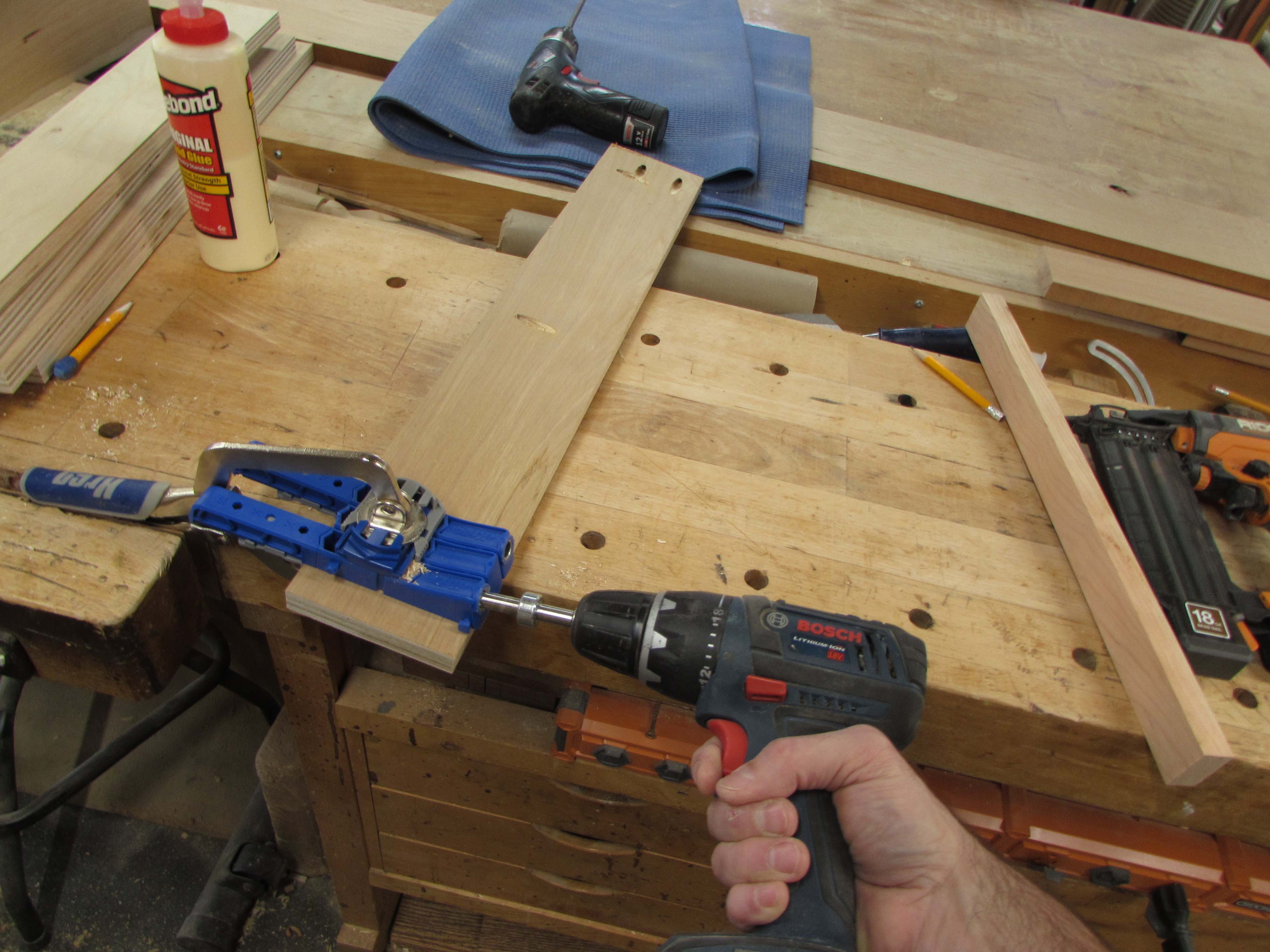I used a different pocket hole jig to create these holes than I used on the base. That one could be easily moved around from piece to piece, this one stays clamped to the bench.