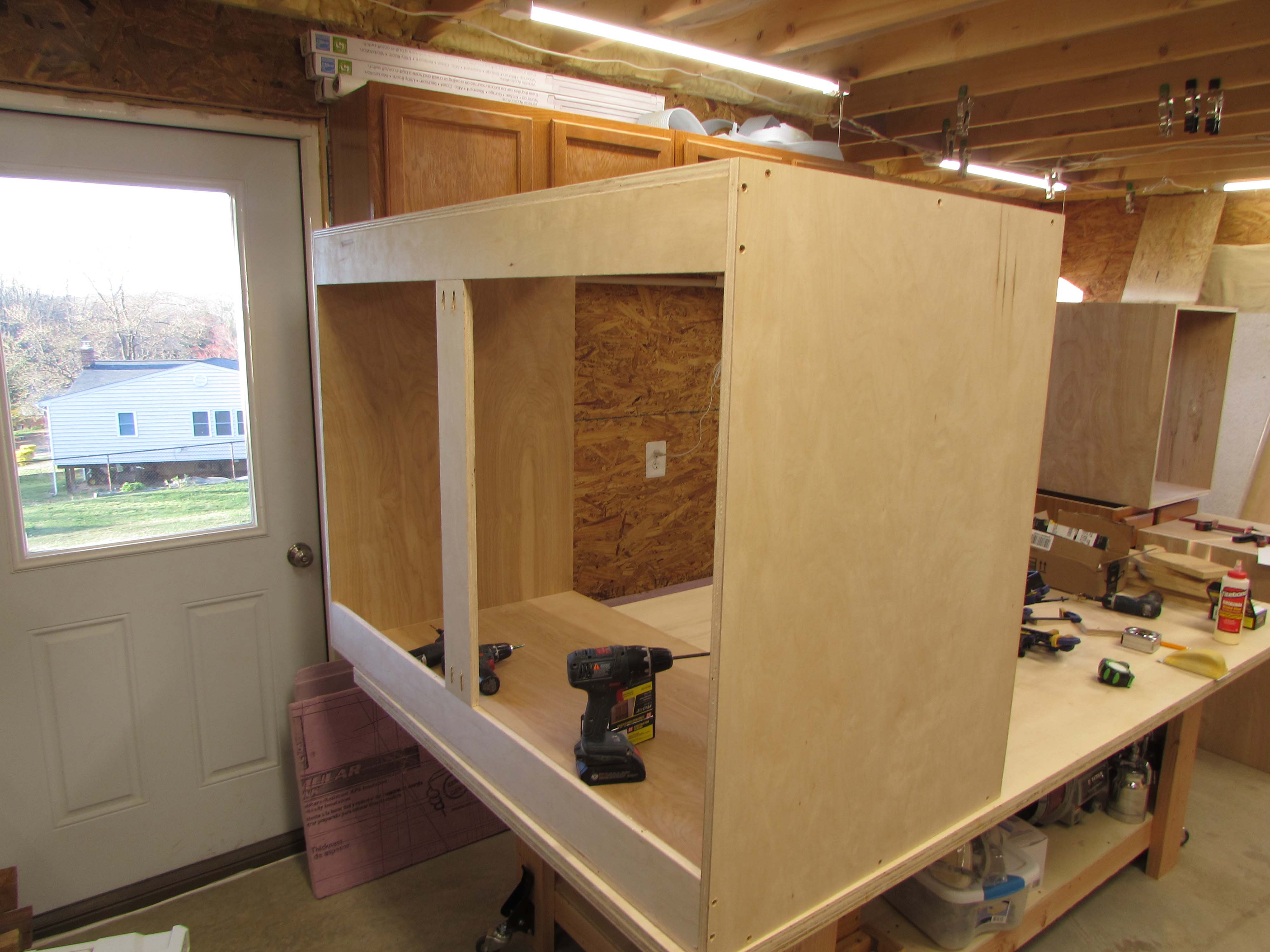 Before starting this project, I took a day to build a mobile assembly table. The top is (2) sheets of 3/4″ plywood, giving me a dead flat 4’x8′ work surface that is 30″ tall. It is low enough to comfortably work when breaking down plywood or assembling cabinets.
