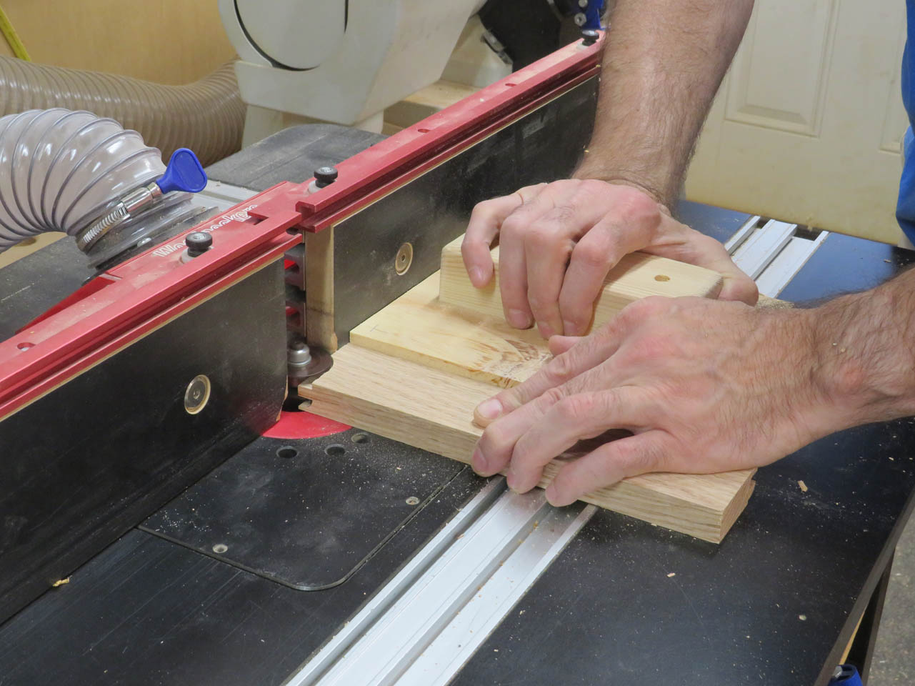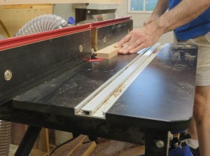Then I swapped routers and ran the end cuts on the horizontal pieces using a push block to keep the pieces square and give them a backer to help prevent tear-out.