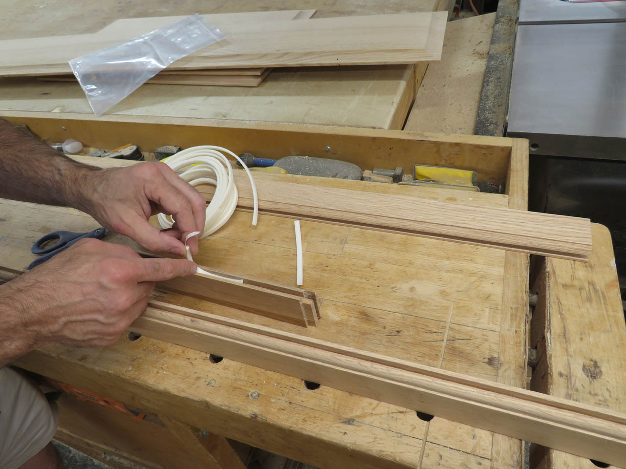 Next, I hand sand all of the edges that I just cut and place spacer foam in the channels to keep the door from rattling but allow room for expansion and contraction.