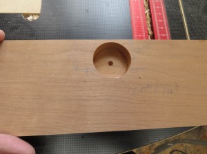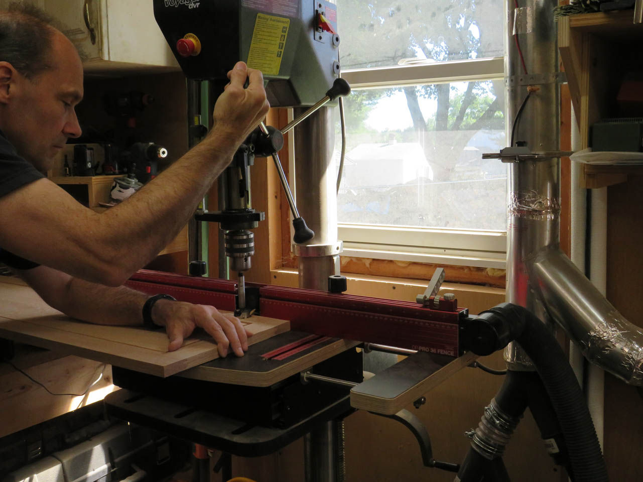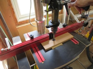 This allows me to align the 35mm forstner bit in the drill press to the fence. Then all I need to do is set the proper depth on the current door panels.