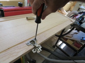 After sanding both sides, I turned my attention to installing the hinge hardware. The hardware really doesn’t need to be installed before finishing, but the holes should be drilled now.