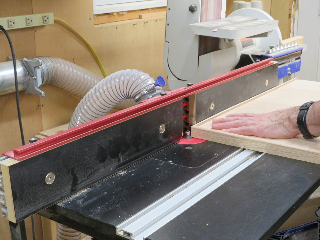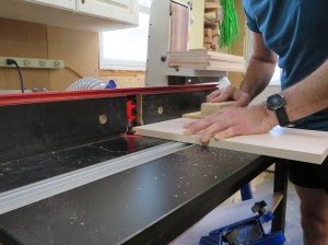 Then I can run my drawer parts through the router, using a square push block to keep the piece square and prevent tear-out.