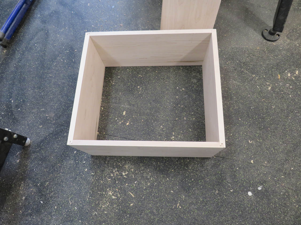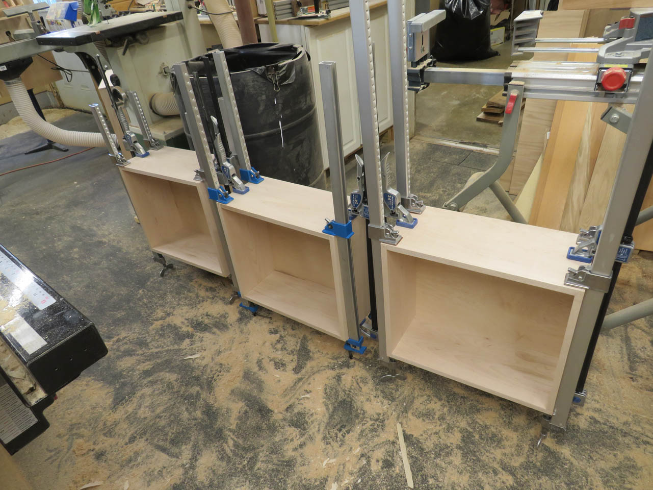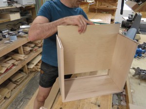 Glue gets brushed onto all of the glue joints, then I can start to assemble the boxes. Three sides get put together first, then the plywood bottom is slid into place before the last side gets attached.