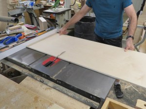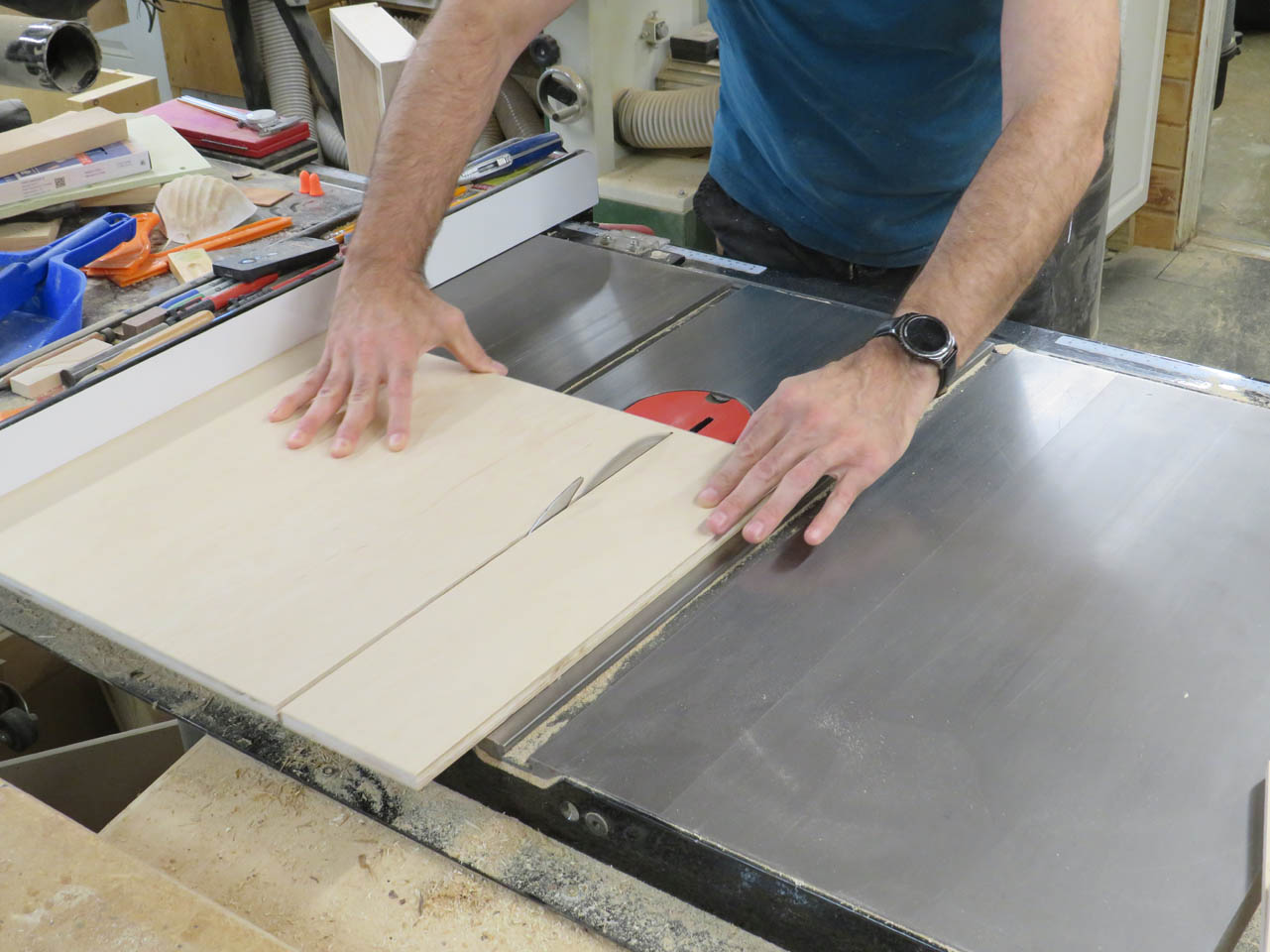 With the sides all prepped, I grabbed an off-cut piece of 1/2″ maple plywood to cut out the drawer bottoms.