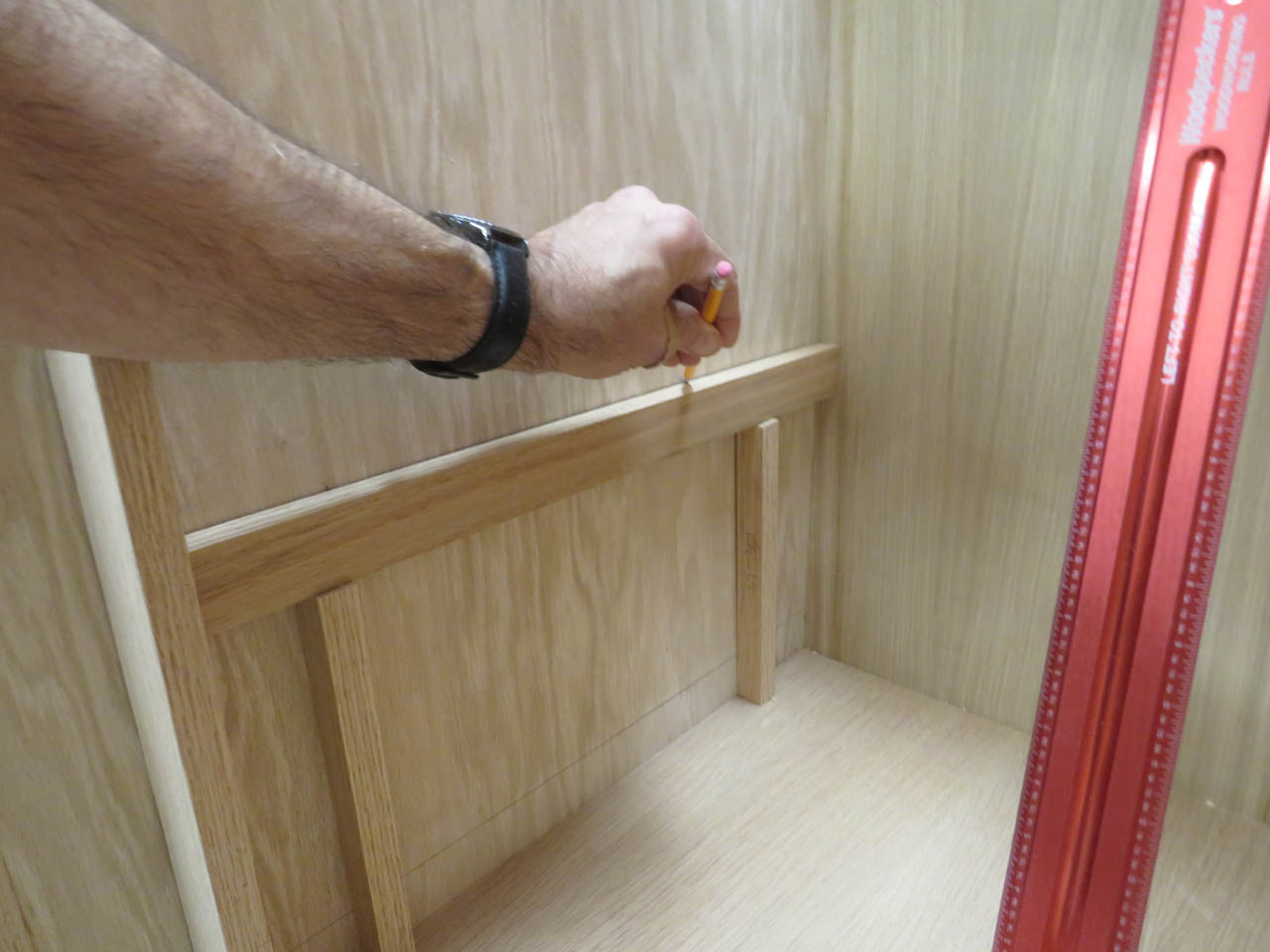 The cabinets will need blocking installed on the left side to mount the drawer slides to. the right side is a divider that does not have a face frame in front of it, so it only needs to have marks for the slide’s mounting locations. To set these locations, I cut blocks to mark the correct height on each side.