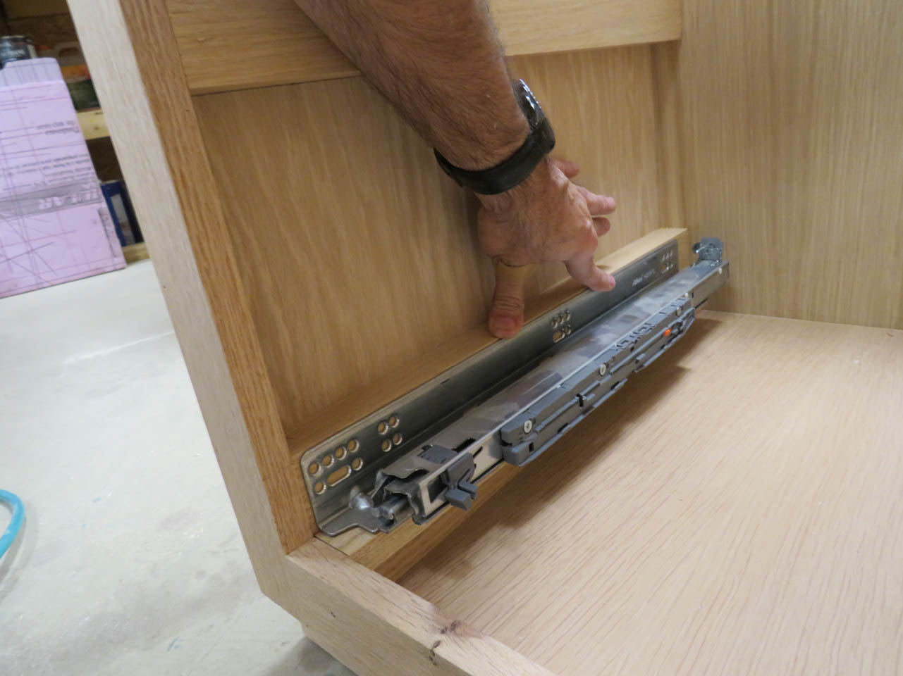 For the undermount hardware to get attached, a small notch gets cut into the bottom rear of each side of the drawer.