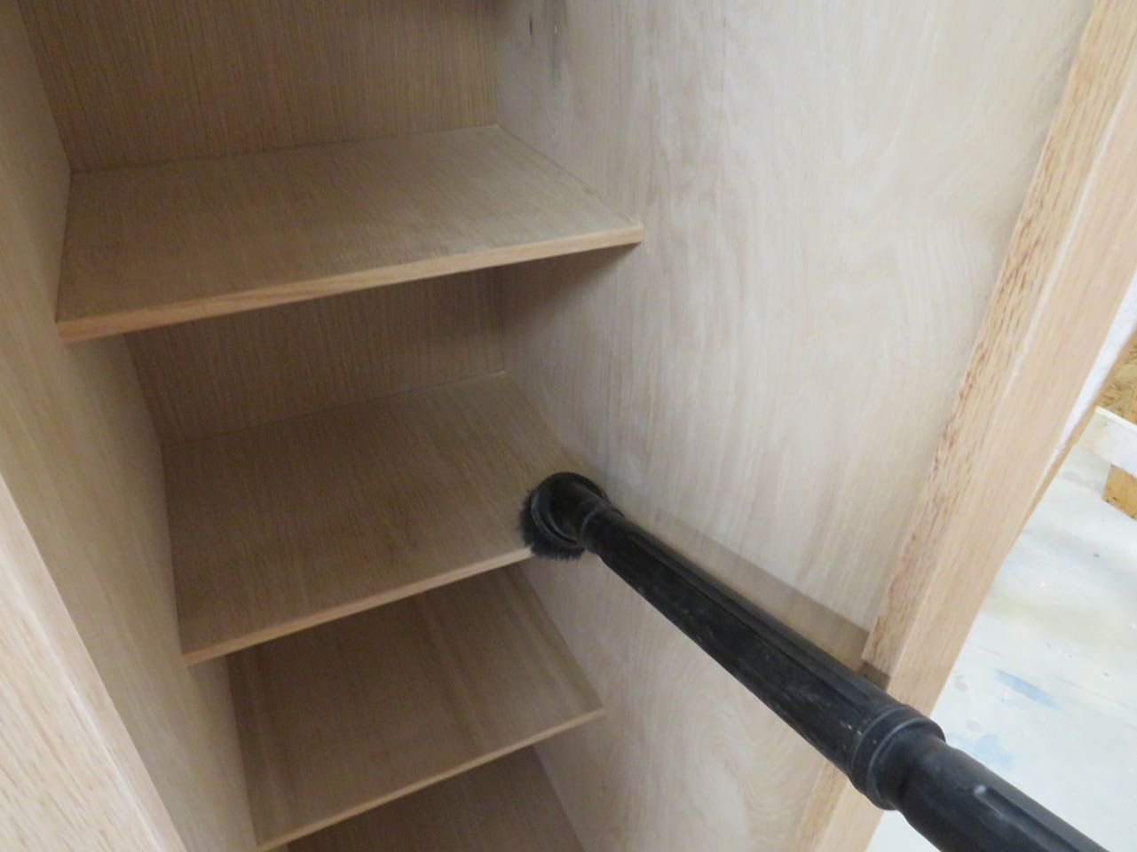 After sanding, all the surfaces need the dust removed. I use a vacuum with a brush on the end.