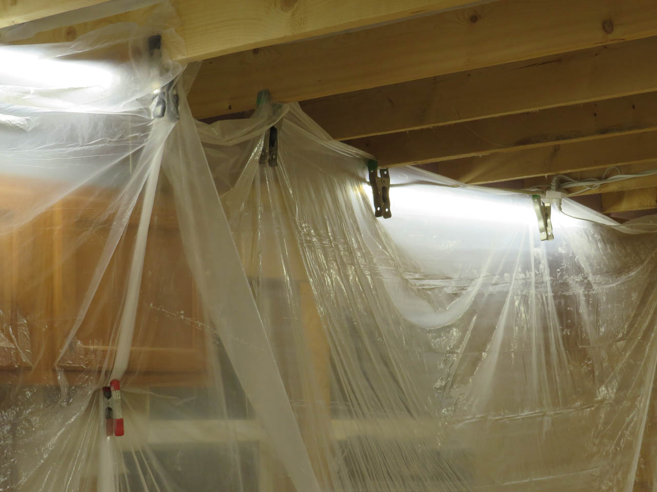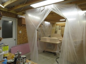The booth is plastic sheeting, clamped to the joists on the ceiling. There is also a fan in the window to help draw out the overspray.
