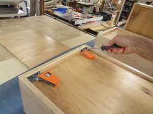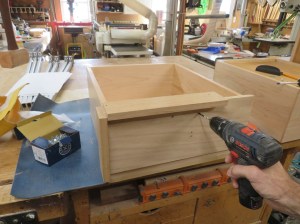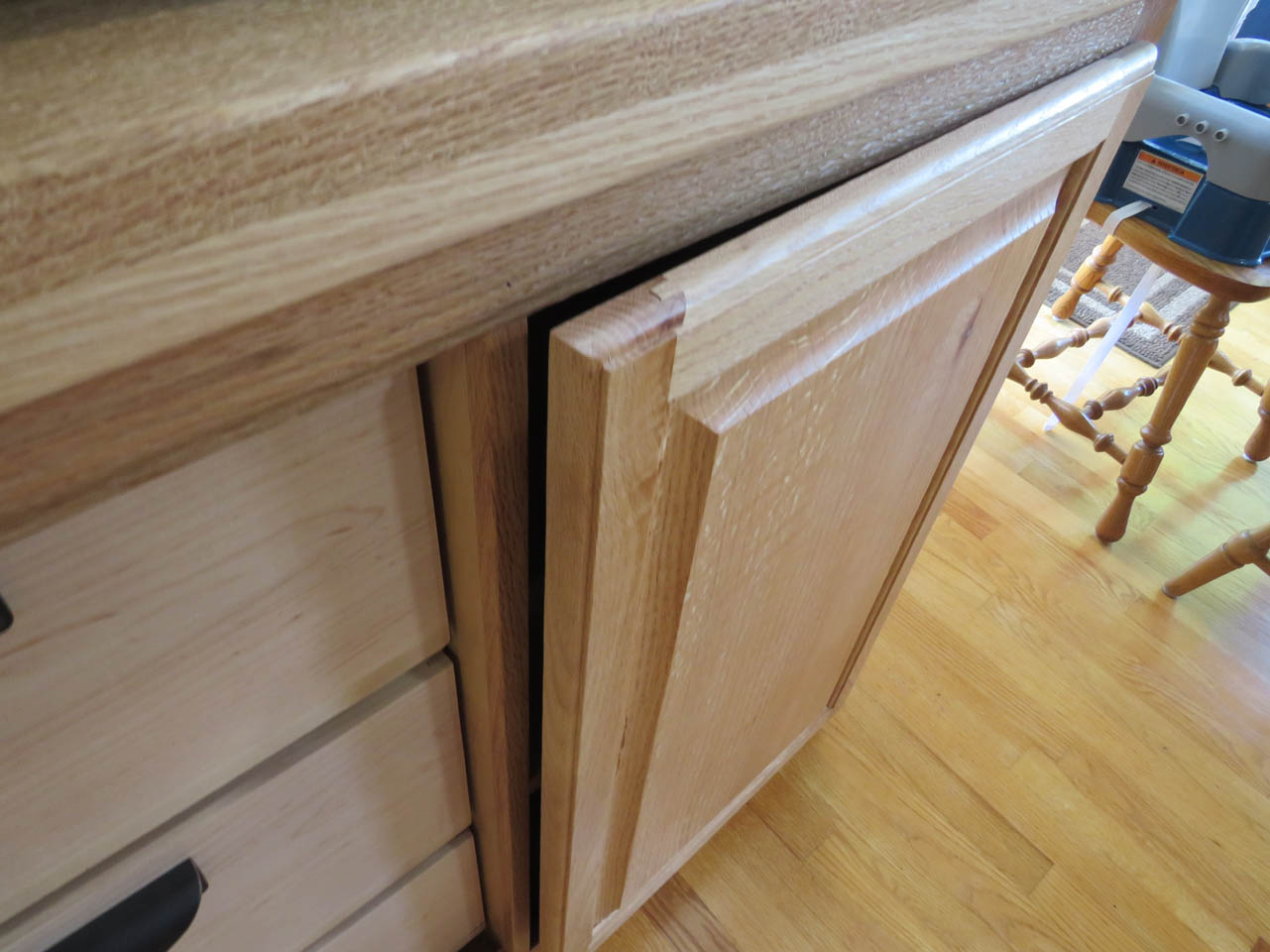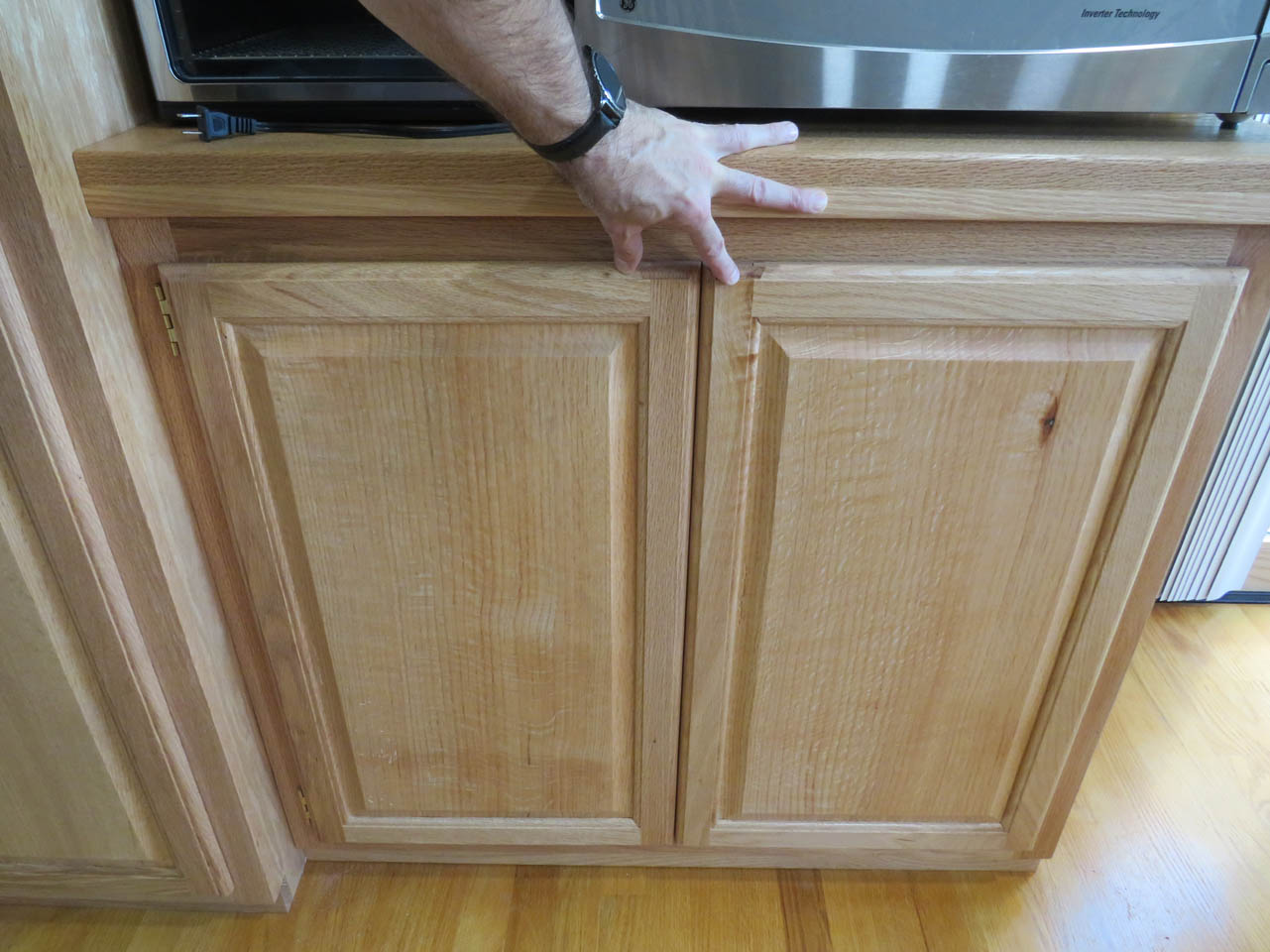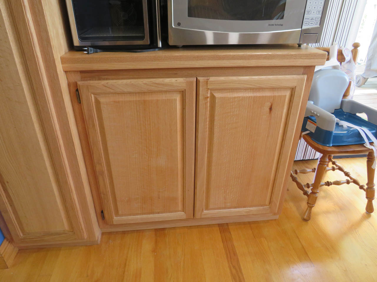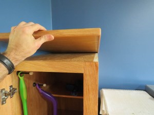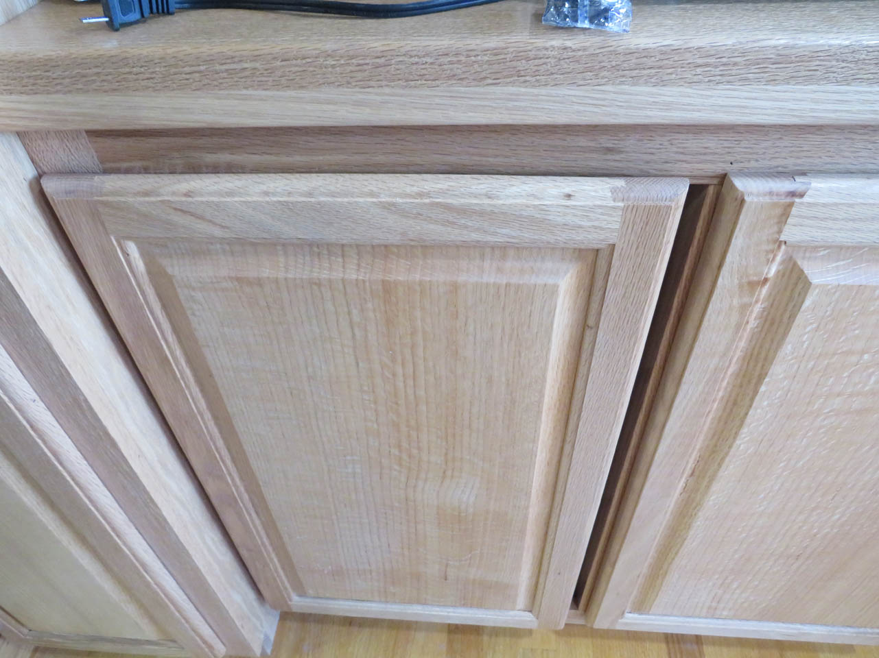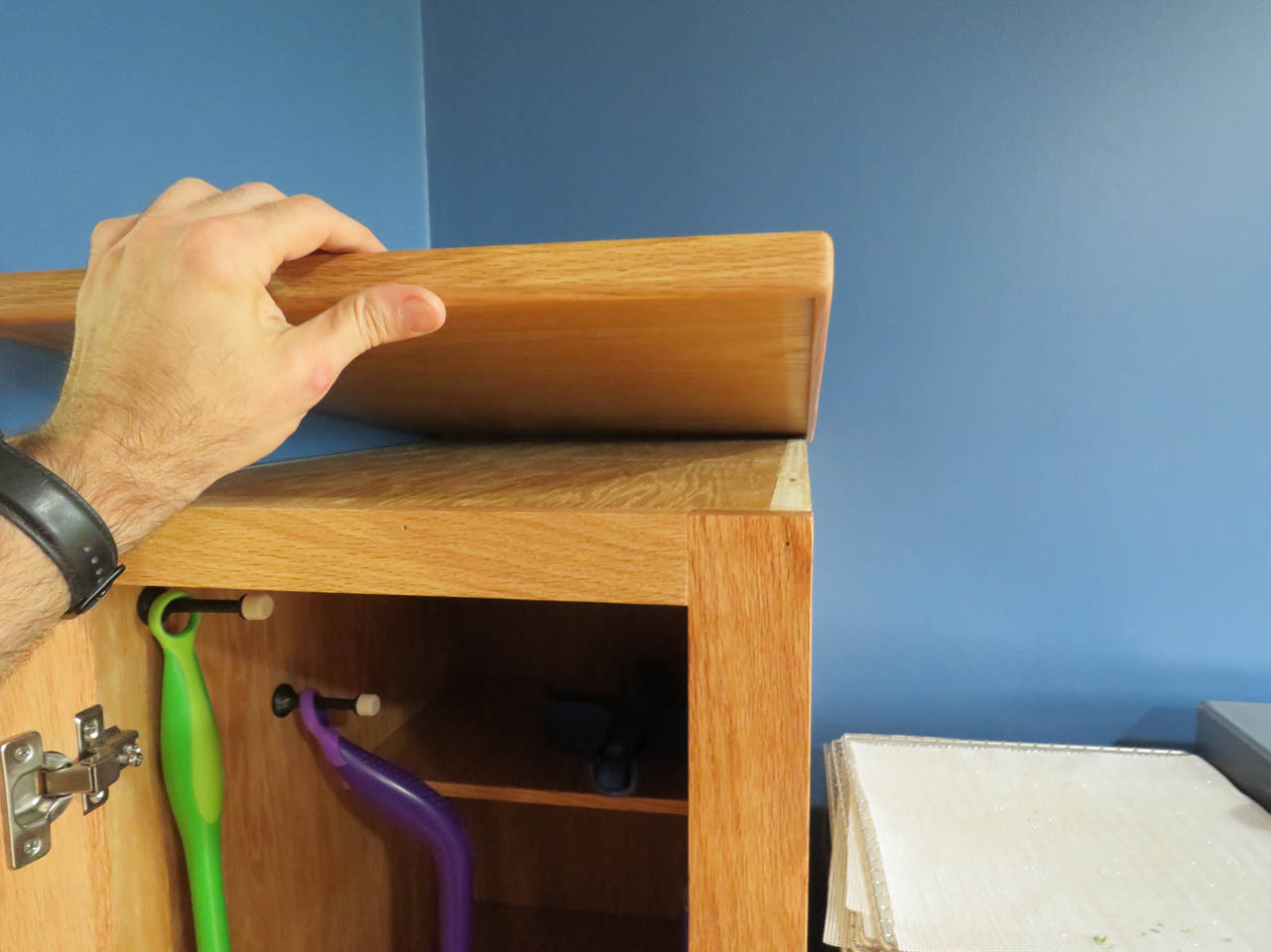 The final piece is the top for the tall cabinet. This was held in place the same as the countertop on the shorter cabinet. I used some 1-1/4″ washer-head screws at each corner from below.