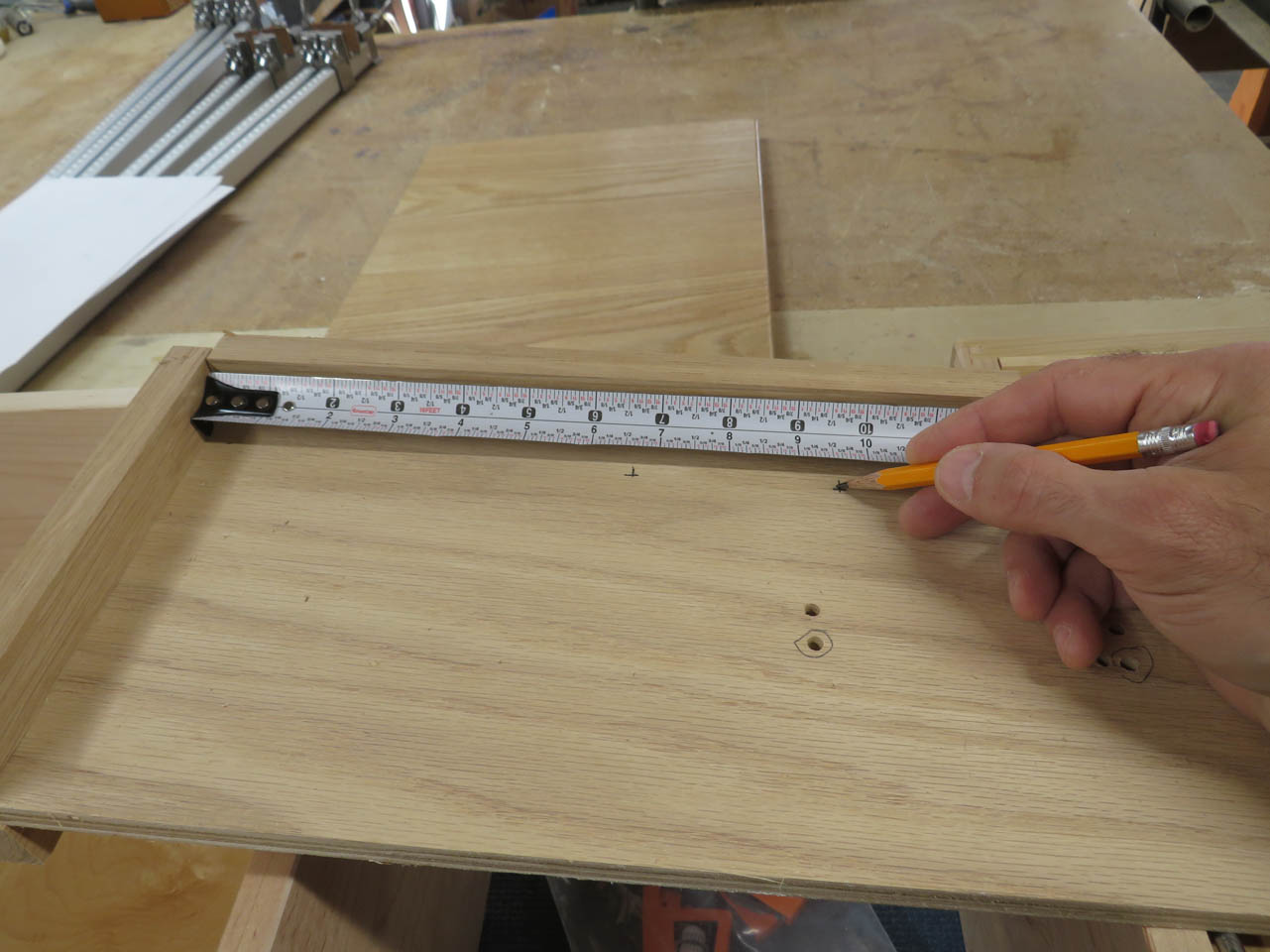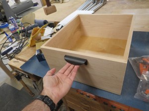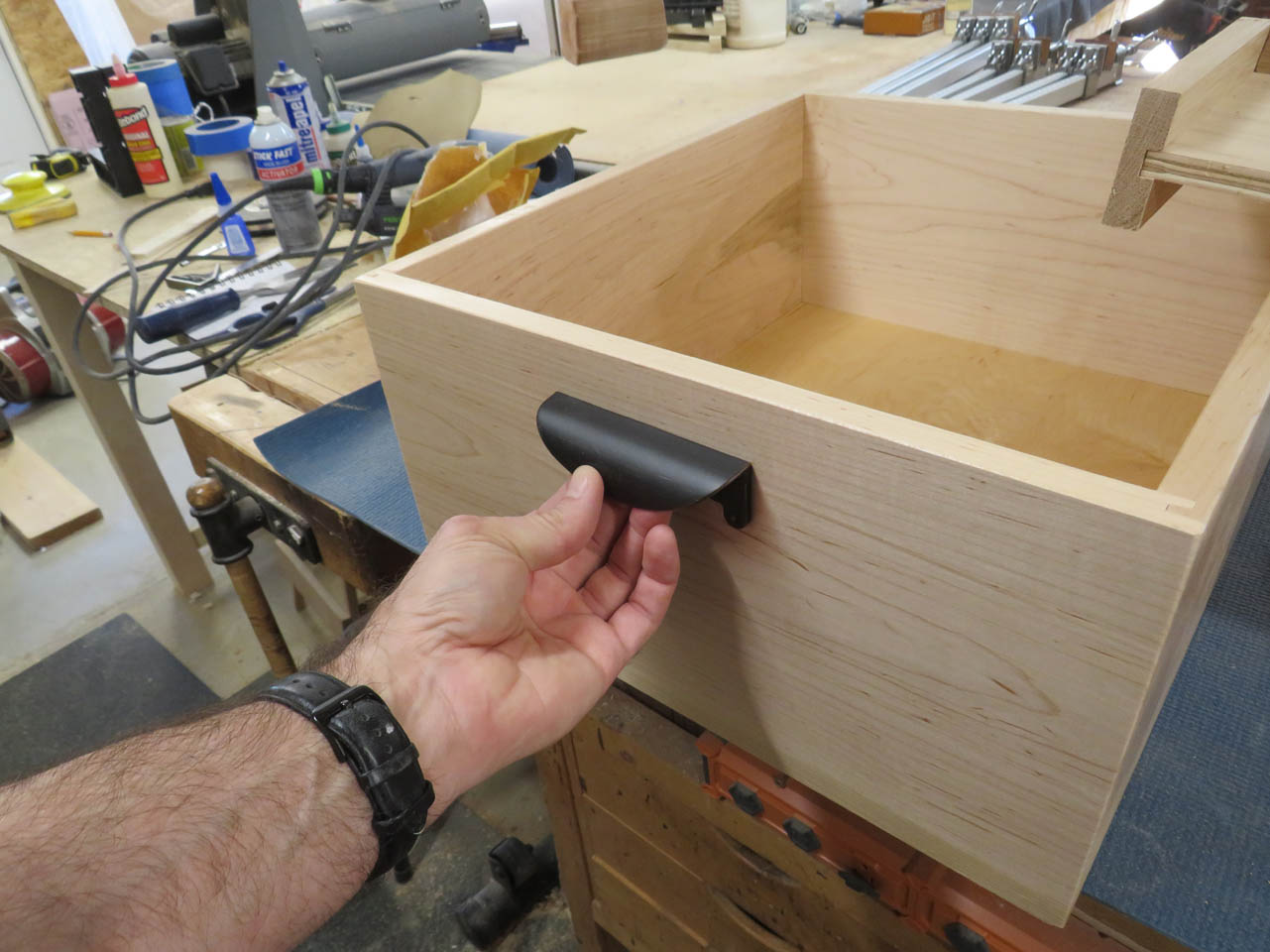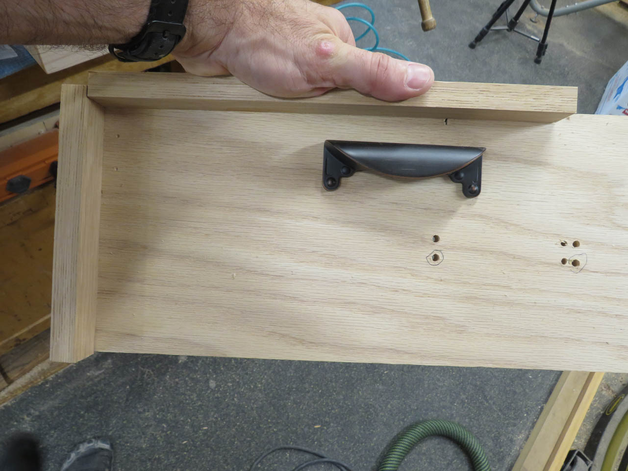 To install the drawer pulls, I have a jig that attaches to the top and side of a drawer. I marked and drilled holes through the jig to match the drawer pulls.