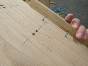 I can then hold the jig to the front of my drawer and drill the holes through the pilot holes in the jig.
