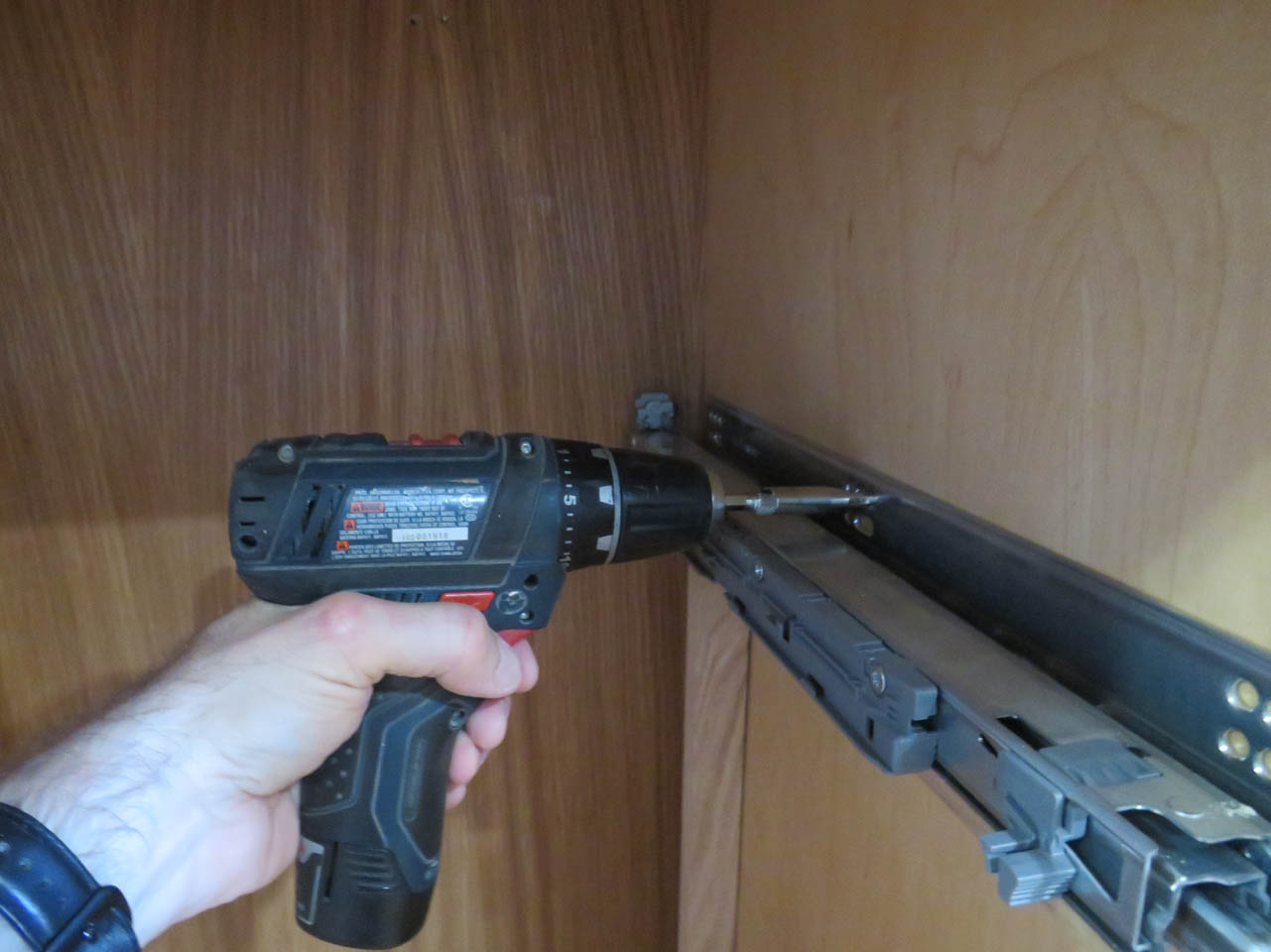 I pre-drilled three holes on each slide and screwed them on by hand.
